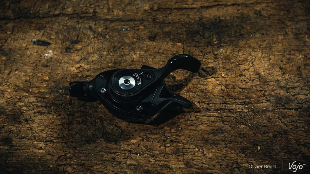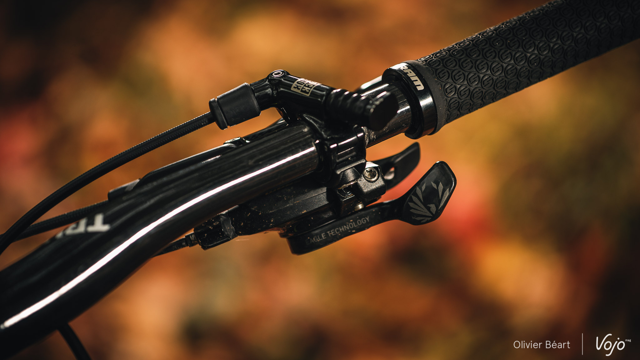 Le shifter Sram XX1 Eagle est très proche de ses prédécesseurs et on est ici en terrain connu. L’ergonomie est parfaite, les changements de vitesse vifs et précis et les possibilités de réglages de la manette de montée des rapports permettent d’ajuster parfaitement la commande à ses envies.