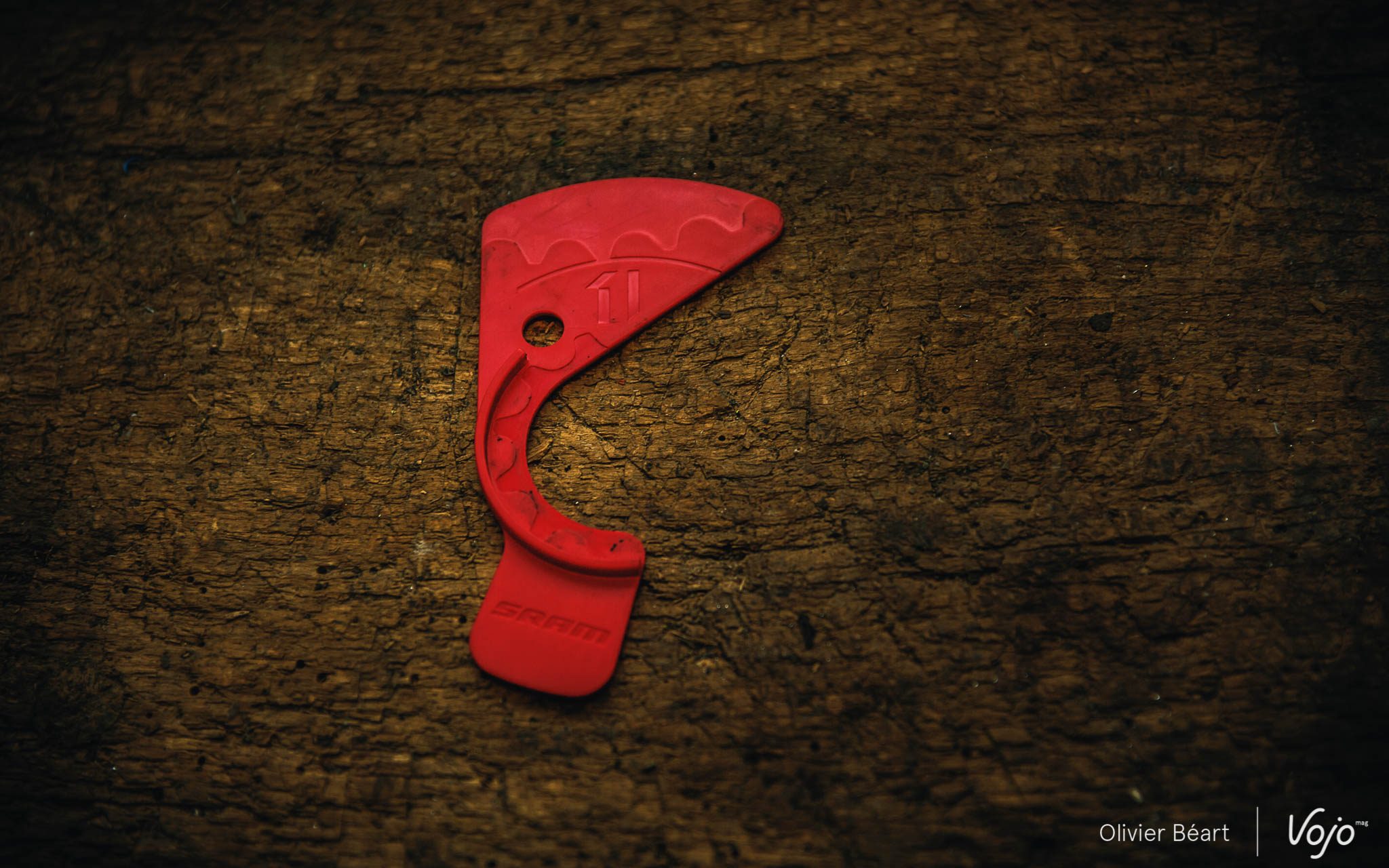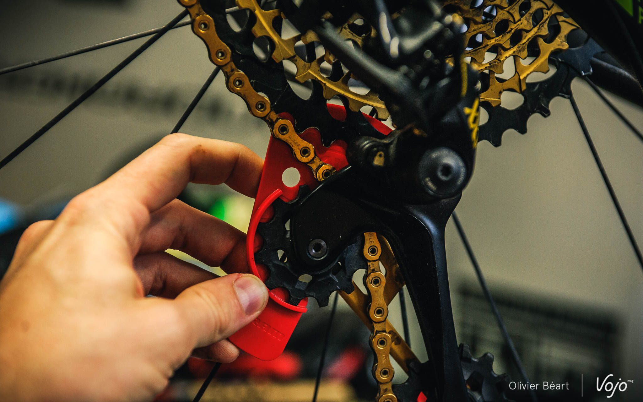 Quand on l’a en mains, on prend conscience de la taille de l’engin et on comprend assez vite l’importance d’un réglage aux petits oignons. C’est encore plus vrai dans le cas d’un full suspendu, où l’action de la suspension va induire de petits mouvements qui peuvent, en cas d’ajustement approximatif, perturber le bon fonctionnement de l’ensemble. Pour faciliter le travail des mécaniciens, Sram a mis au point un petit outil bien pratique qui se place entre le grand pignon et le galet supérieur pour s’assurer que la distance entre les deux est parfaitement conforme aux préconisations du constructeur.