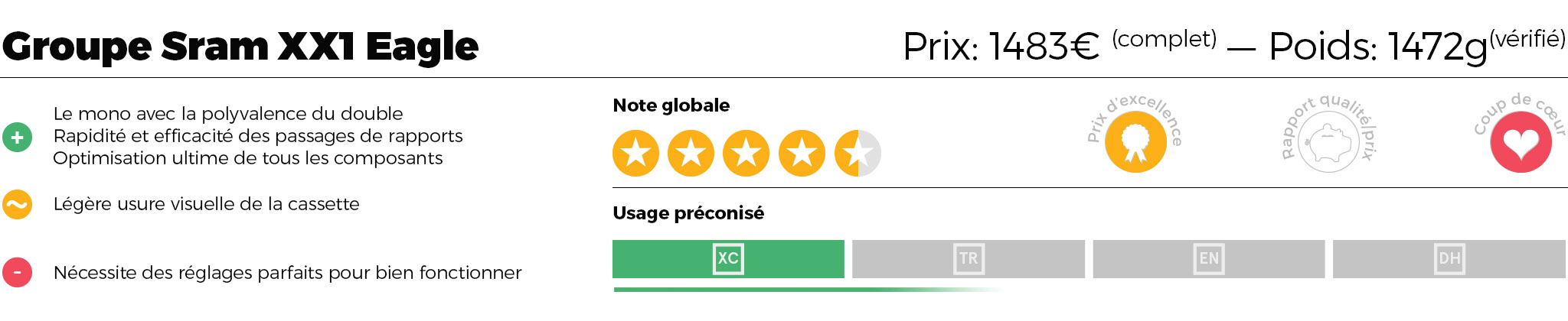 Riche d’enseignements, ce test du nouveau groupe Sram XX1 Eagle nous a montré que le passage à 12 vitesses permet bel et bien à la transmission mono-plateau de gagner une polyvalence qui la rend désormais apte à séduire quasiment tous les bikers et à rivaliser complètement avec le double. En outre, les modifications effectuées à tous les étages permettent de gagner encore un peu en rapidité, en efficacité et en silence de fonctionnement. Cet essai laisse également entrevoir de belles perspectives au niveau de la durabilité des pièces d’usure, qui devrait être supérieure à celle des transmissions 1×11 Sram. Nous devons par contre bien mettre en garde les amateurs : pour en profiter pleinement, ce groupe nécessite un réglage absolument parfait et que tous les paramètres annexes soient aussi au top (patte, câblerie). Un biker averti en vaut deux et, voyant cela, on se dit qu’il ne sera pas aisé pour Sram de faire des versions réellement accessibles en 12 vitesses, type GX ou NX. Du moins pas tout de suite. Véritable aboutissement du travail de Sram sur le mono-plateau, le XX1 Eagle touche du doigt la perfection, mais sa sensibilité et sa complexité lui font louper de peu les 5 étoiles.