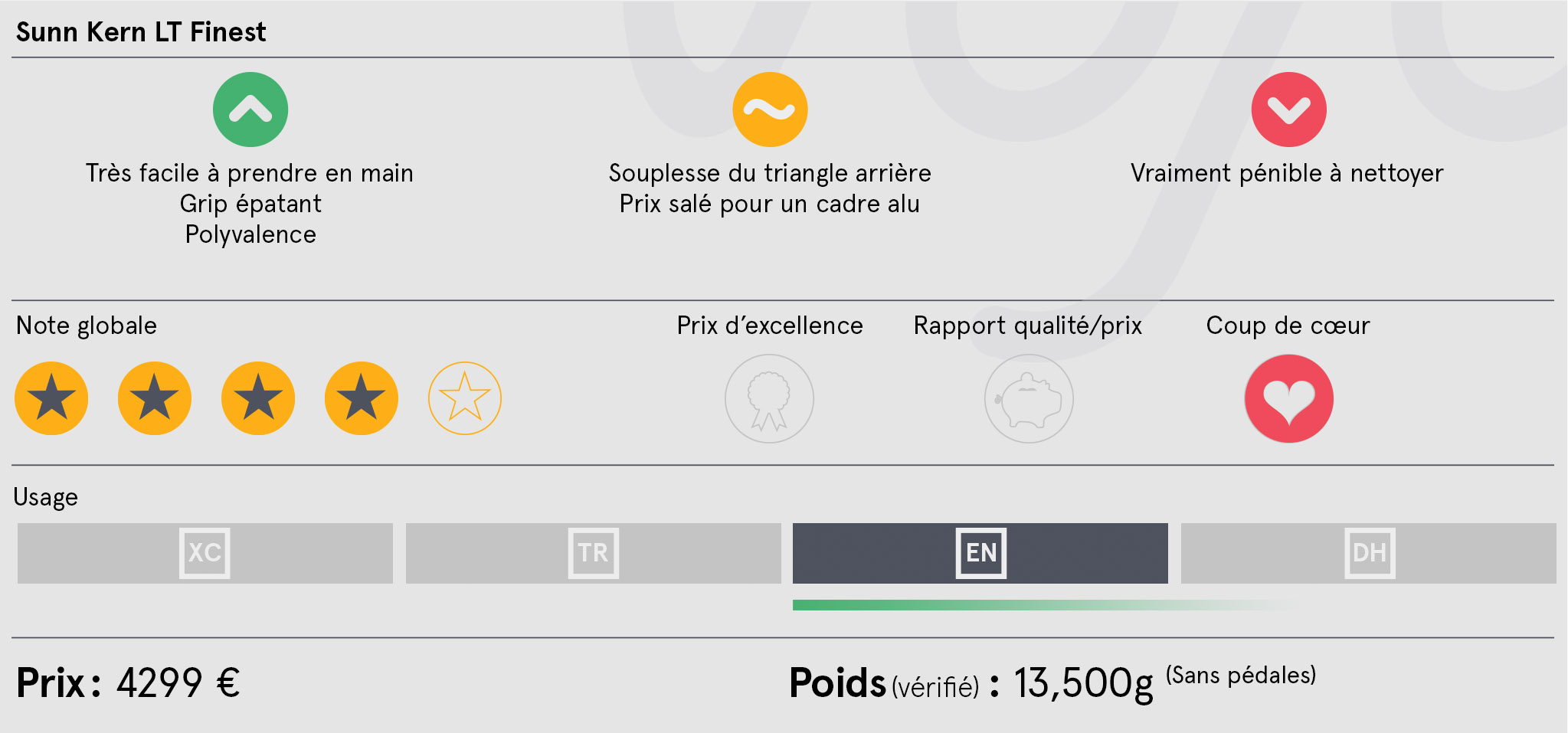 Le Sunn Kern LT est le modèle dédié à l’enduro et il s’équipe de roues de 27,5 pouces de diamètre. Avec ses 160 millimètres de débattement à l’avant comme à l’arrière, il se décline en trois modèles : le Kern LT S1 (2999 euros), le Kern LT Finest (4199 euros) et le Kern LT Replica (6699 euros). C’est sur le modèle intermédiaire, le Kern LT Finest, que nous avons jeté notre dévolu. Pas forcément le plus accessible, il se présente toutefois comme un ensemble fiable et doté d’un équipement adéquat pour une pratique sérieuse de l’enduro.