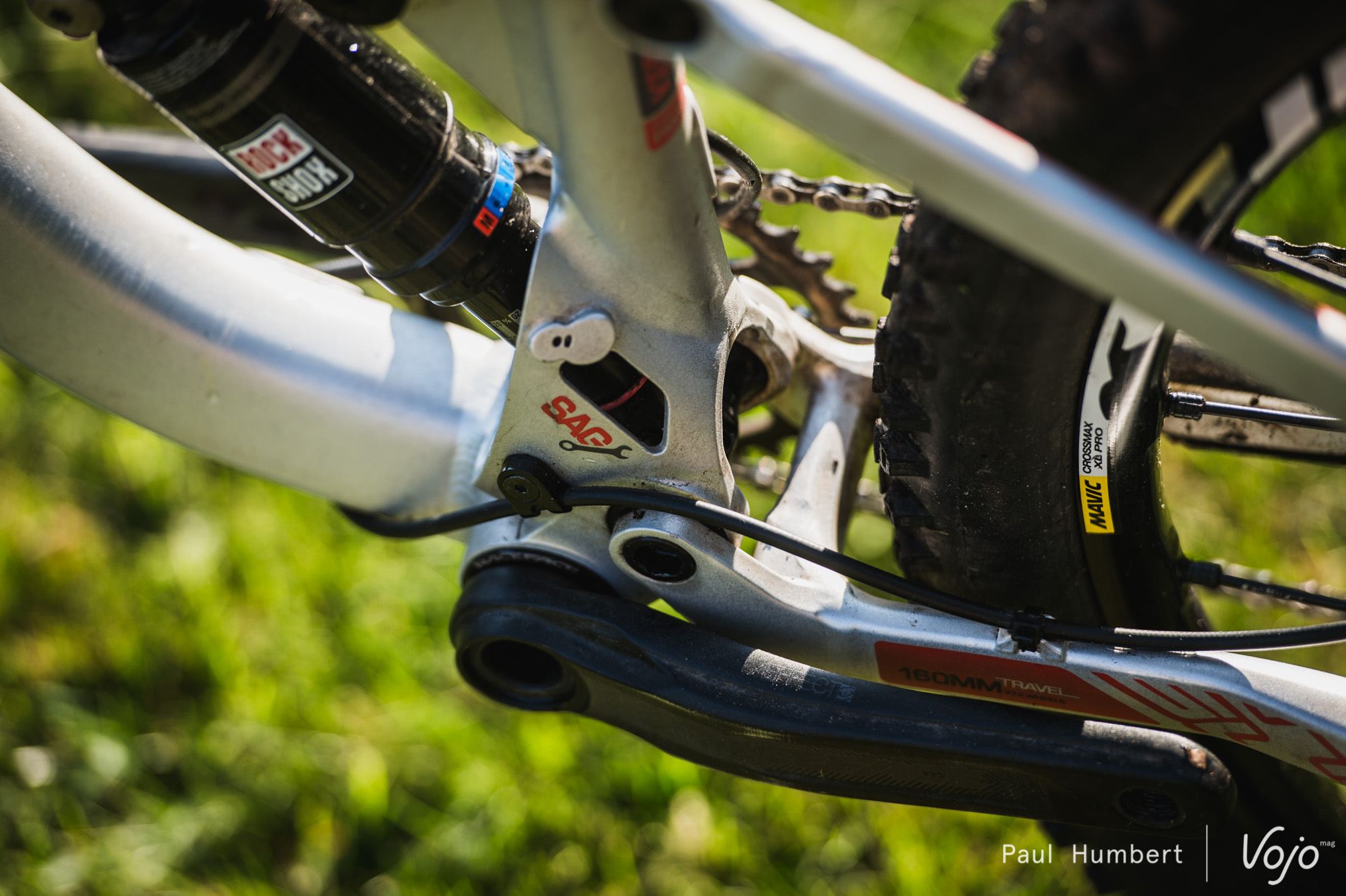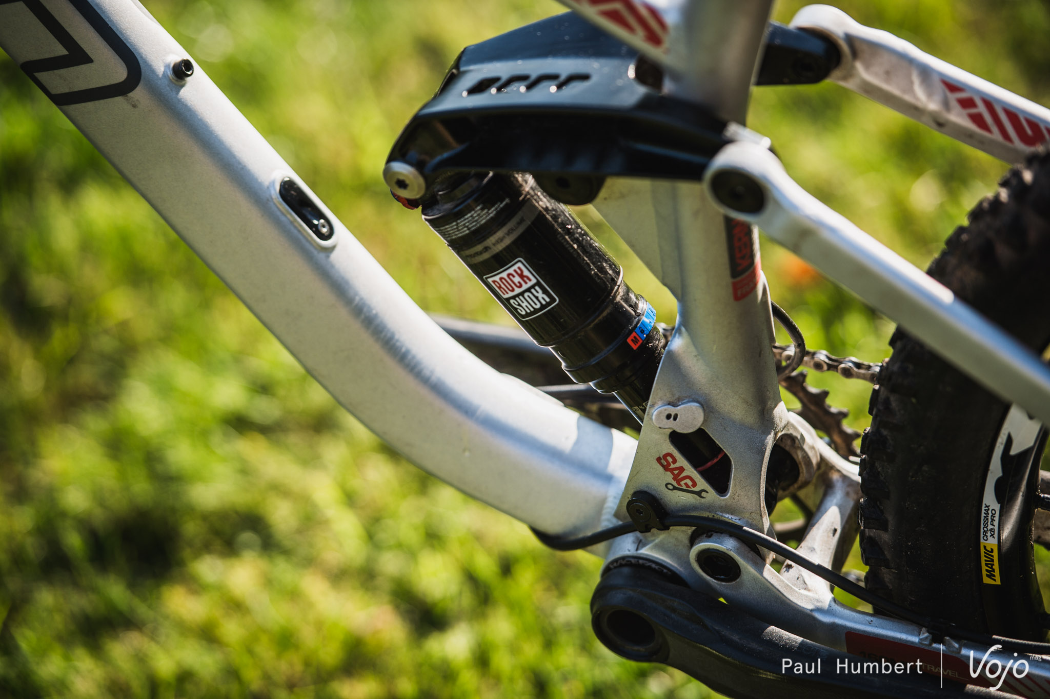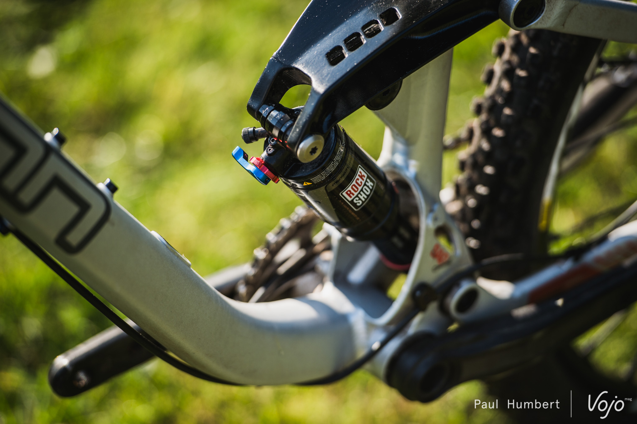 En s’attardant sur le cadre, on découvre des passages de câble en interne et une petite fenêtre dans la jonction tube de selle – tube inférieur permettant de mesurer son sag, l’amortisseur étant en partie camouflé par le cadre.