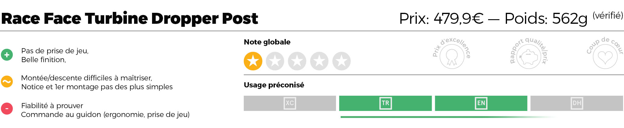 Nous attendions beaucoup de cette tige de selle télescopique Race Face Turbine mais c’est hélas une grande déception. Habitué à un très haut niveau de qualité des produits de la marque dans tous les domaines, nous avons été surpris d’avoir entre les mains un accessoire bien fini et à la conception qui semble bien pensée sur le papier, mais qui ne tient pas du tout ses promesses sur le terrain. Outre les problèmes de fiabilité rencontrés avec le premier exemplaire, le deuxième ne nous a pas non plus convaincus tant au niveau de l’ergonomie de la commande au guidon – un point crucial sur une tige télescopique – qu’en ce qui concerne le fonctionnement (vitesse et fluidité de la remontée). Seul point positif, elle ne prend pas de jeu et la finition reste belle dans le temps. Nous lui donnerons une nouvelle chance un peu plus tard, avec l’autre commande au guidon, en espérant que Race Face aura amélioré son produit et que nous trouverons enfin ce que nous attendons de ce type d’accessoire, à savoir tout simplement qu’il réponde présent quand on a besoin de lui et que le naturel de son fonctionnement lui permette de se faire oublier. Ce qui n’est pas le cas actuellement.