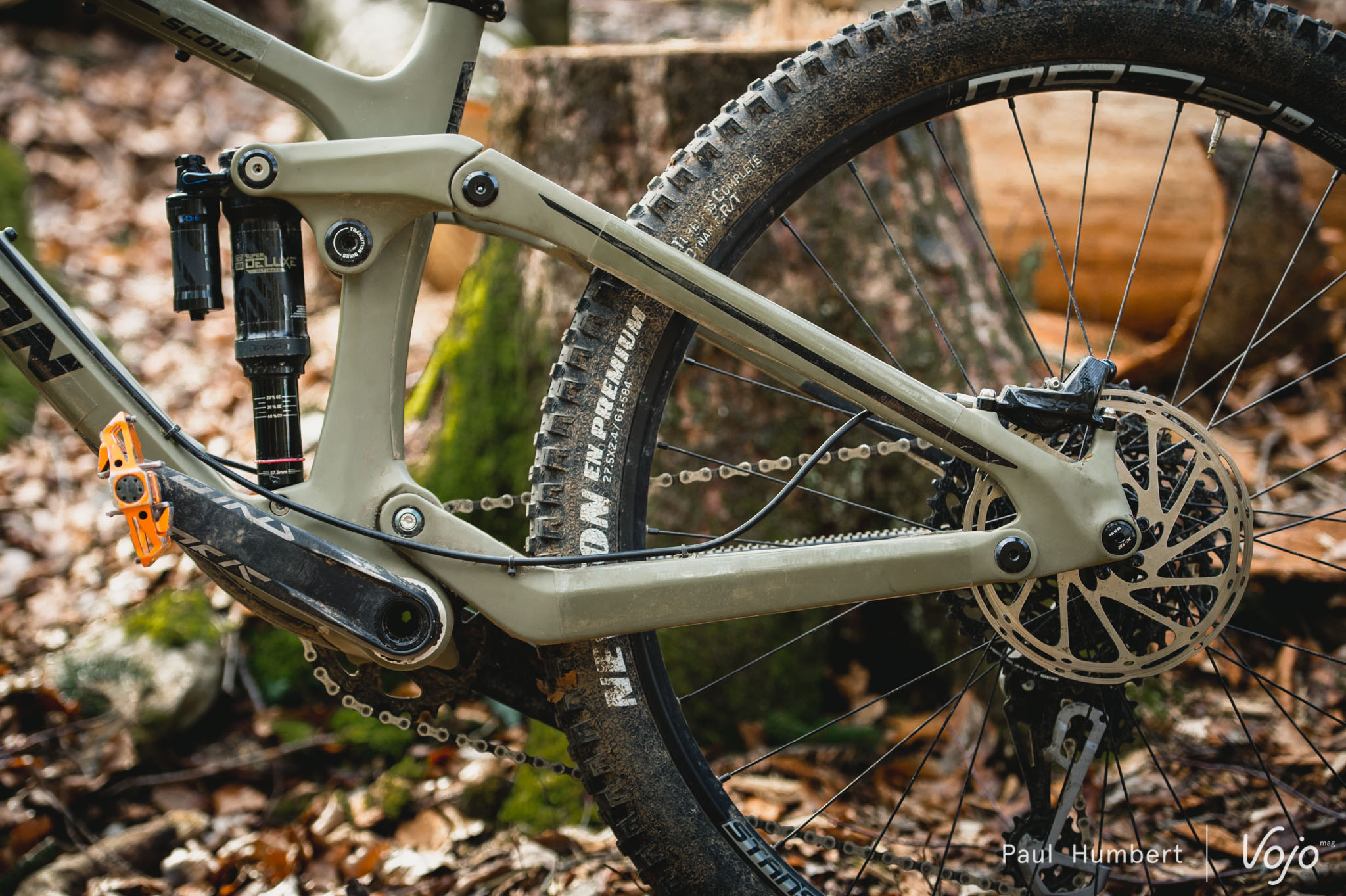 Pour finir, un mot sur les équipements. On s’y attendait un peu vu la dureté de la gomme et leur structure, mais les pneus Goodyear Newton EN sont loin des Maxxis Assegai et DHR II montés d’origine sur le vélo en ce qui concerne les performances en descente. Sur terrain sec, ils manquent de grip sur l’angle et dans la boue ou sur terrain gras, ils se transforment très vite en savonnettes. Heureusement, on sent assez bien quand on approche des limites et ils décrochent rarement par surprise. On peut donc adapter son pilotage et jouer un peu plus avec la glisse du vélo, plutôt que de rouler sur des oeufs en permanence en redoutant la perte d’adhérence. Leur gomme dure et leurs crampons de tailles moyenne deviennent en revanche des alliés lorsqu’il s’agit de pédaler sur des chemins roulants ou sur un bout de route pour rejoindre une descente puisque ces pneus « collent » alors bien moins que les Maxxis du montage de départ.