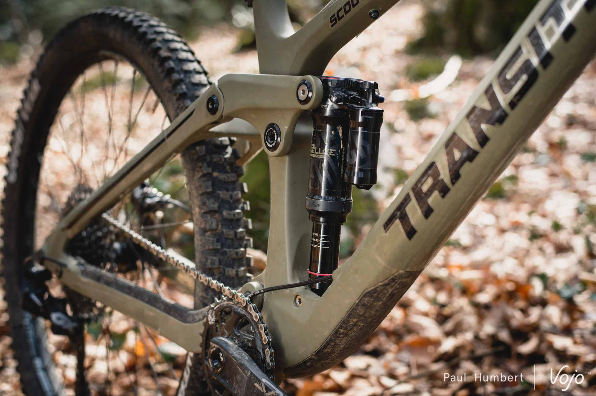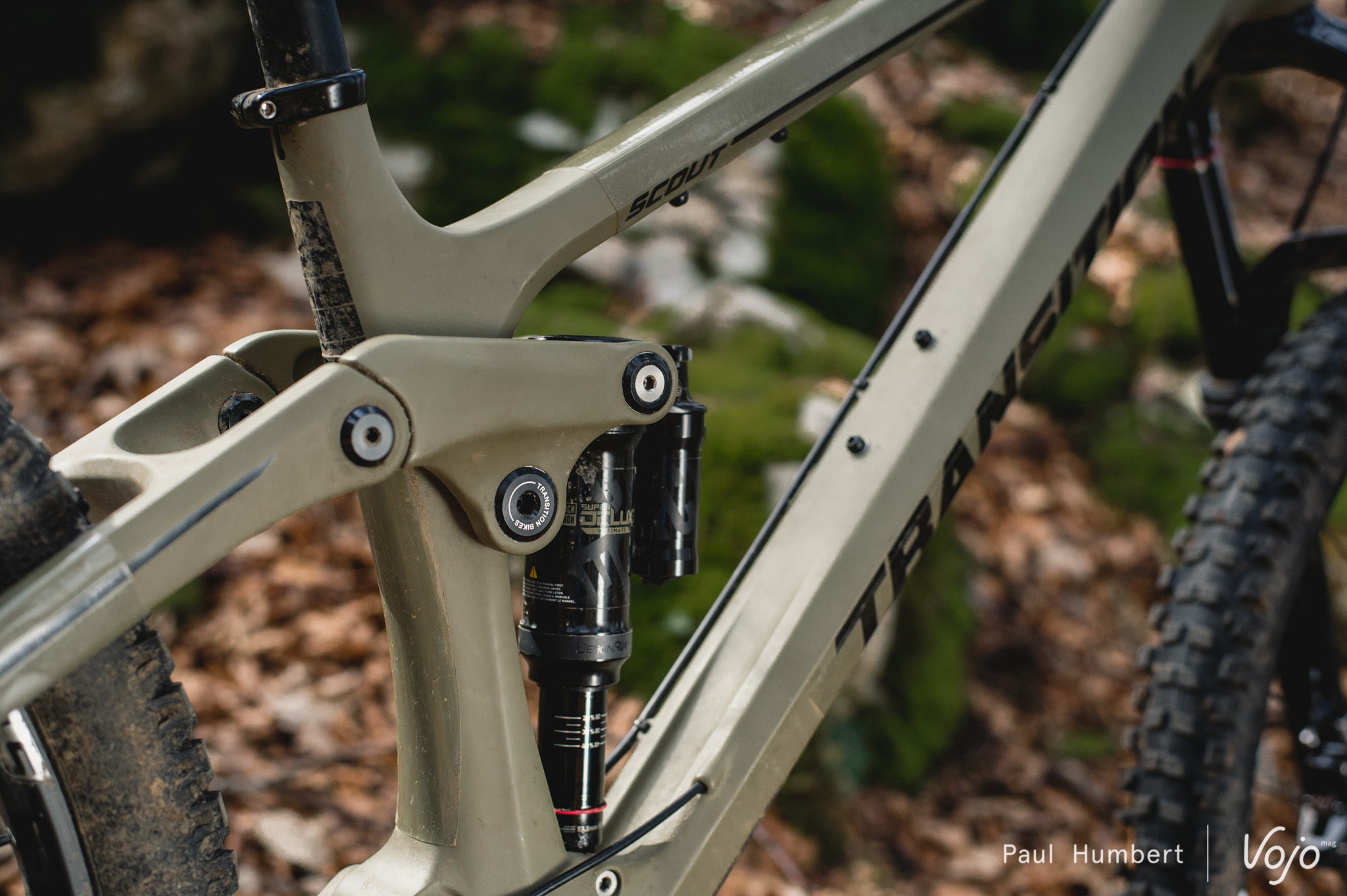 Particularité de ce nouveau Scout, le débattement arrière peut être porté à 150 mm en changeant l’amortisseur. En effet, le cadre est conçu autour d’un amortisseur en 205 mm d’entraxe mais il existe deux courses pour cette dimension : 57,5 mm et 62,5 mm. De série, le Scout est monté avec un amortisseur en 205 x 57,5 mm et développe 140 mm de débattement, mais le montage d’un 205 x 62,5 mm permet de passer à 150 mm, sans changer quoi que ce soit d’autre sur le vélo. Il est monté sur des roulements de belle taille et bien protégés, ce qui laisse peu de craintes quant à la fiabilité de la suspension.