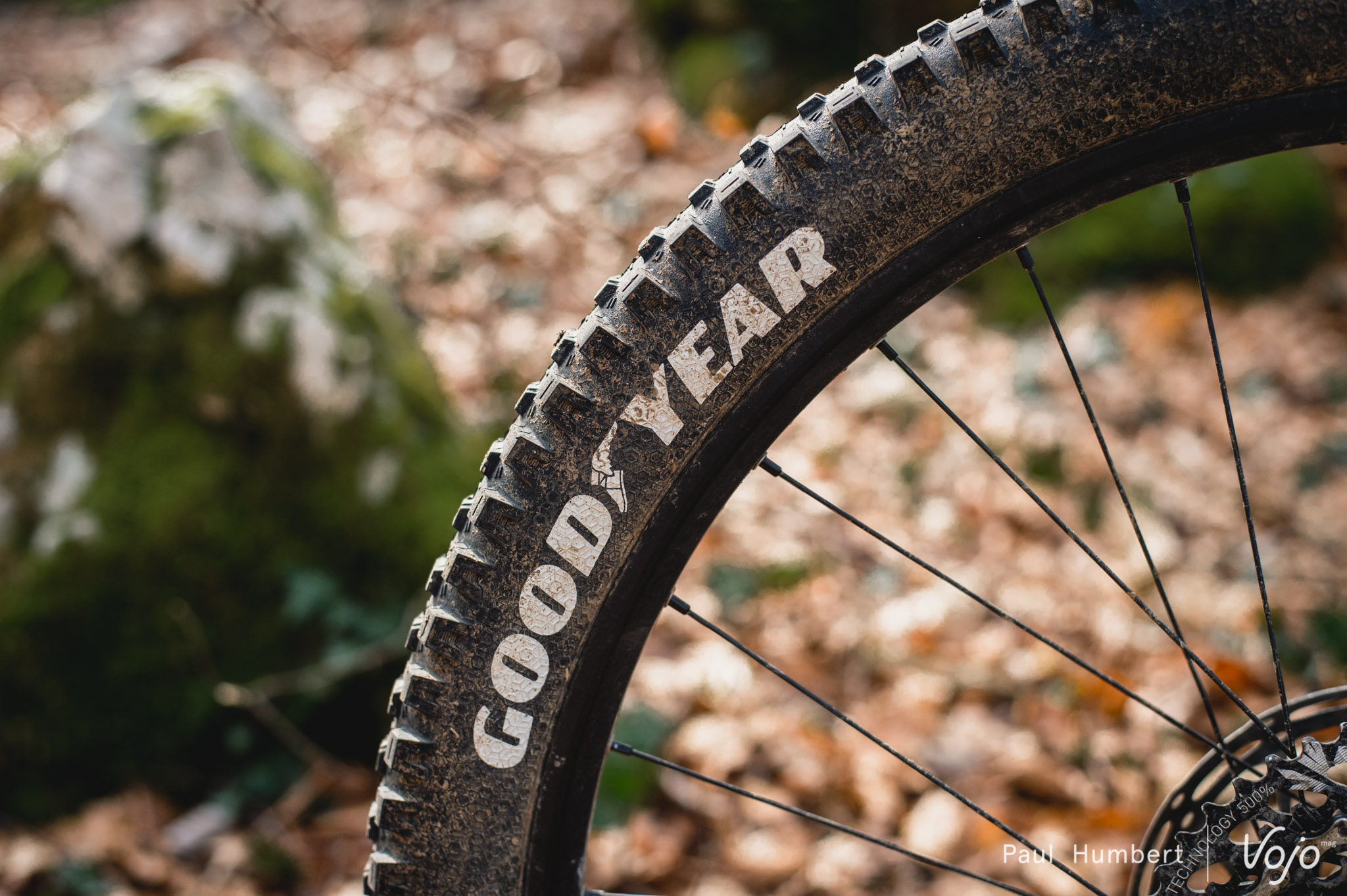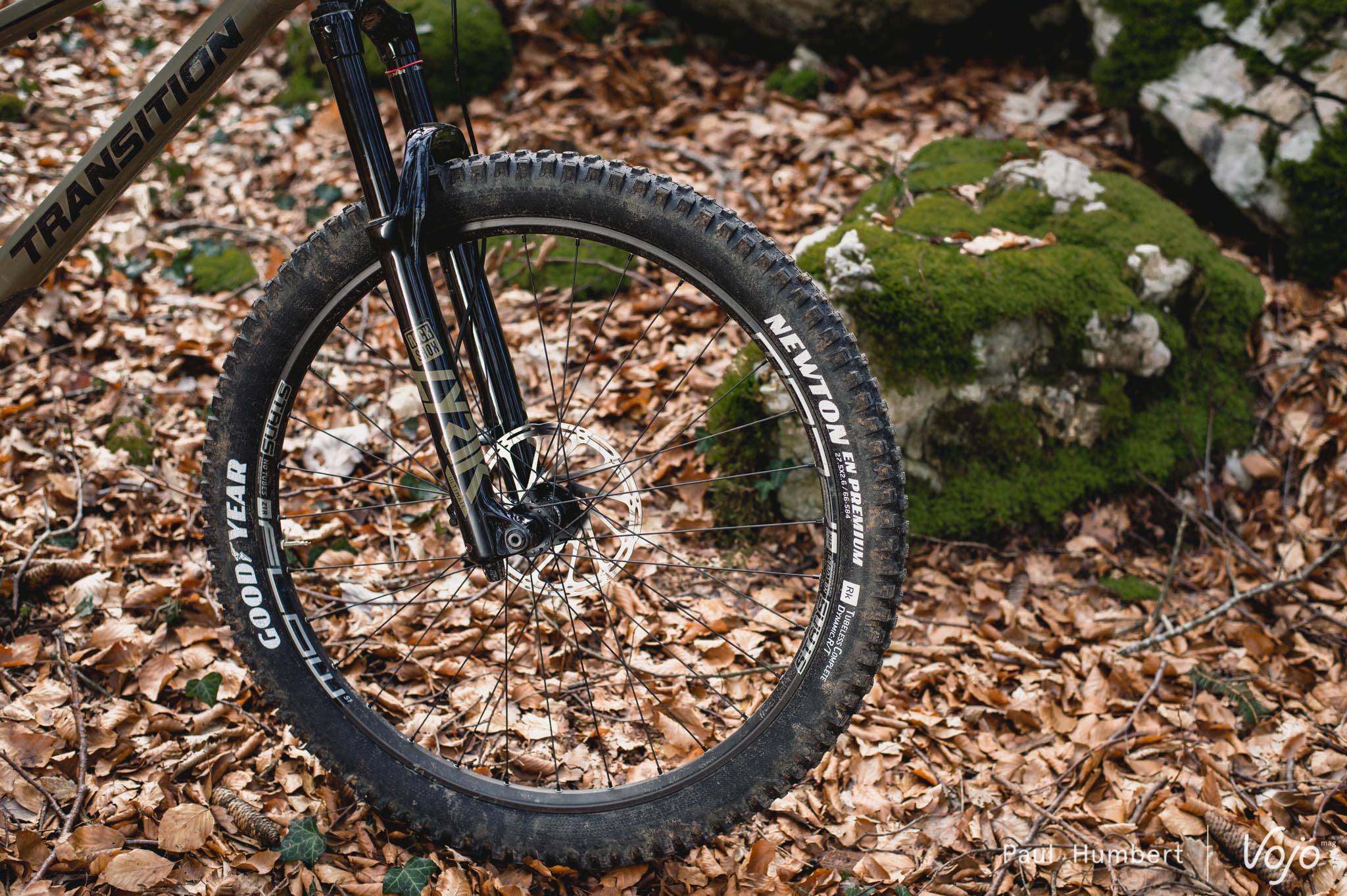 Pour finir, un mot sur les équipements. On s’y attendait un peu vu la dureté de la gomme et leur structure, mais les pneus Goodyear Newton EN sont loin des Maxxis Assegai et DHR II montés d’origine sur le vélo en ce qui concerne les performances en descente. Sur terrain sec, ils manquent de grip sur l’angle et dans la boue ou sur terrain gras, ils se transforment très vite en savonnettes. Heureusement, on sent assez bien quand on approche des limites et ils décrochent rarement par surprise. On peut donc adapter son pilotage et jouer un peu plus avec la glisse du vélo, plutôt que de rouler sur des oeufs en permanence en redoutant la perte d’adhérence. Leur gomme dure et leurs crampons de tailles moyenne deviennent en revanche des alliés lorsqu’il s’agit de pédaler sur des chemins roulants ou sur un bout de route pour rejoindre une descente puisque ces pneus « collent » alors bien moins que les Maxxis du montage de départ.
