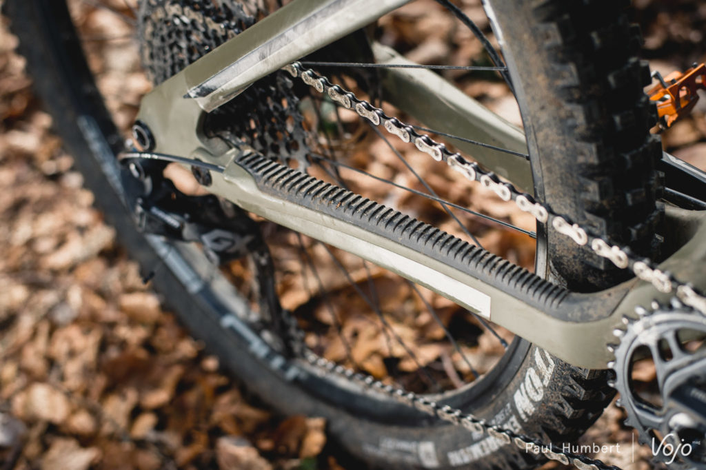 Du carbone oui, mais généreusement protégé. En dehors du film transparent apposé par Race Company (le distributeur Transition pour la France) sur ce modèle destiné aux essais et aux évènements, le cadre peut compter sur de belles protections en caoutchouc sous le tube diagonal, à l’intérieur du hauban droit et surtout sur la base droite, côté transmission. Cette dernière est particulièrement soignée, avec ses lamelles pour atténuer le bruit de la chaîne et son prolongement jusqu’au point de pivot arrière, pour couvrir toute la longueur de la base.