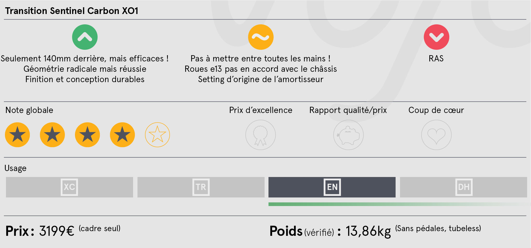 Le Transition Sentinel n’est pas à mettre entre toutes les mains. C’est un outil d’expert, qui pourra s’avérer frustrant pour un débutant ou un pilote pas au top de sa forme, mais qui se révèlera jouissif et d’une efficacité rare aux mains de gars ayant un bon niveau et qui l’emmèneront sur des terrains exigeants et/ou avec du gros dénivelé où il pourra s’exprimer pleinement. Là, sa géométrie radicale mais bien pensée et ses suspensions ultra efficaces permettront de chasser les chronos tout en ayant un sentiment presque déconcertant de sécurité et de facilité. Loin d’être consensuel et accessible, c’est un vélo typé qui respire le terroir dans lequel il est né et la passion de ses pères pour une certaine conception du VTT. Et même si tous nos testeurs n’ont pas pu profiter de ses charmes, on ne peut que se réjouir que ce genre de vélo radical existe car si tout le monde était dans le consensus, qu’est-ce qu’on s’ennuierait !