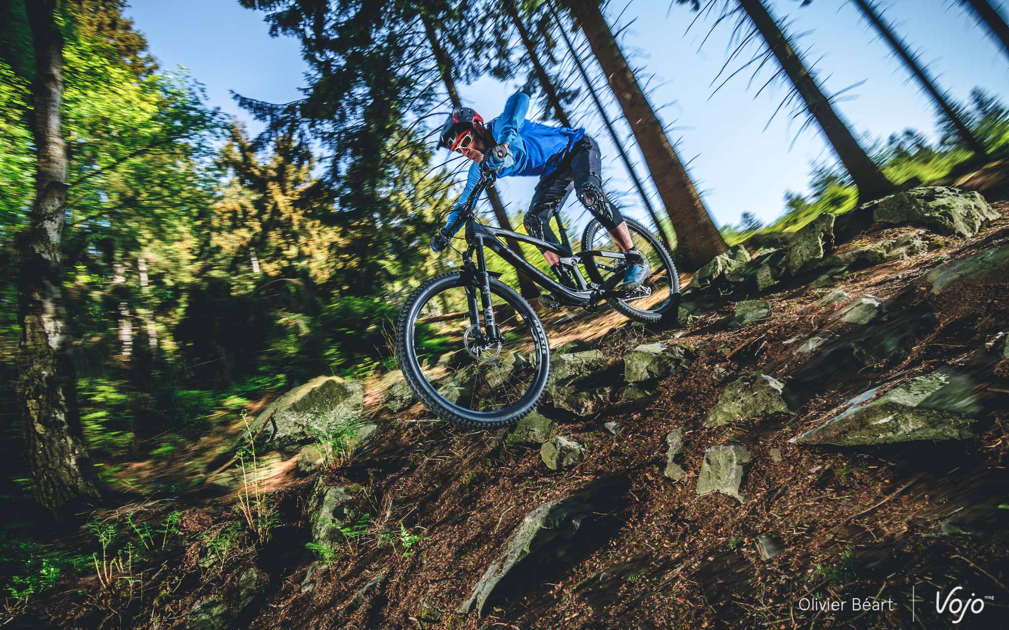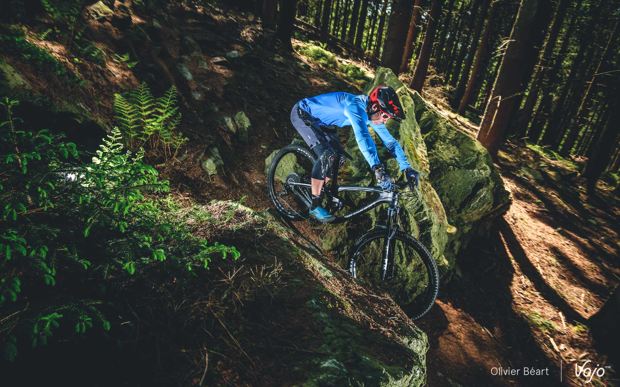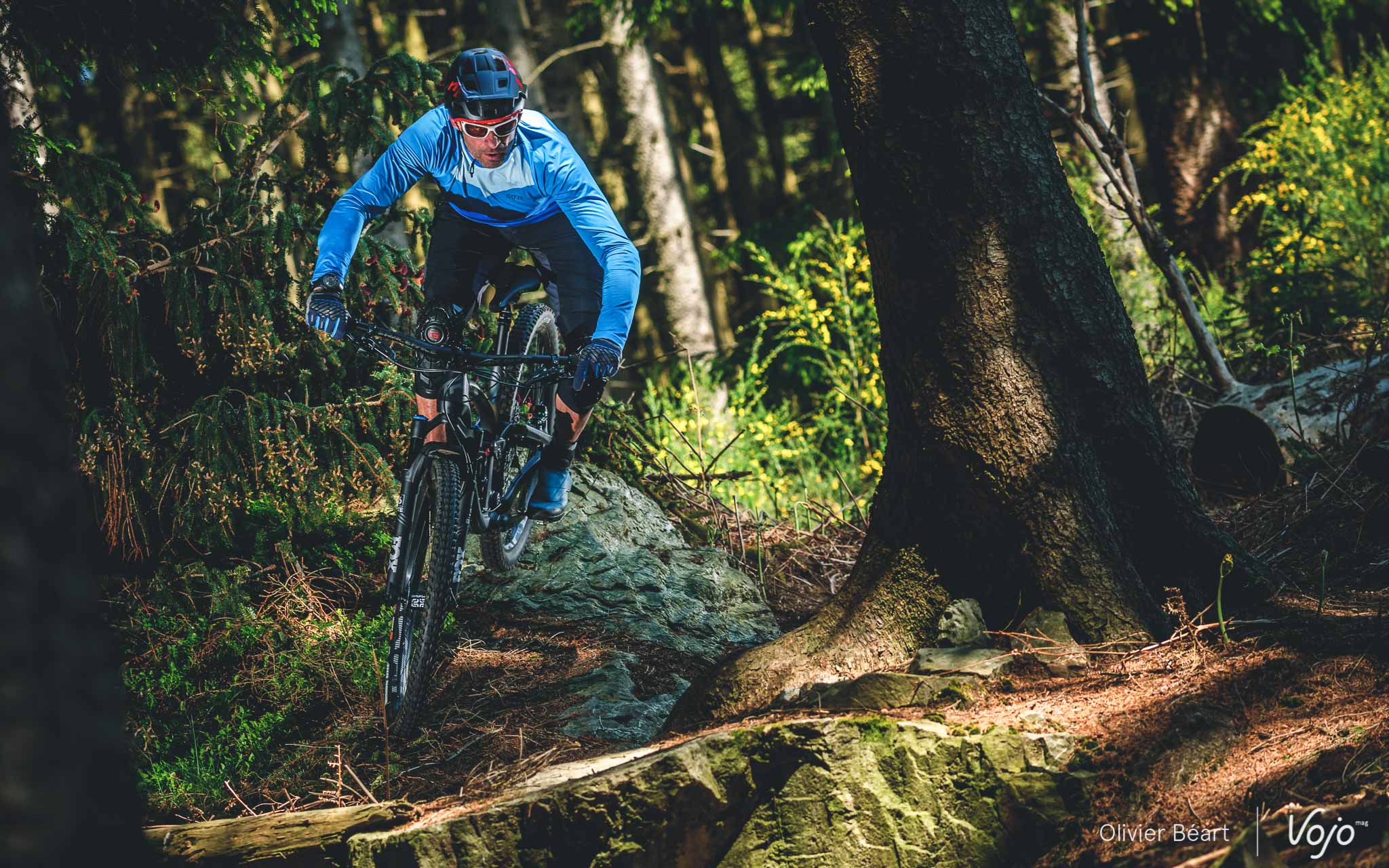 On perçoit immédiatement que le vélo est long, même si avec la potence courte, et le tube de selle très droit, les appuis restent assez familiers. Aux premiers coups de pédales, la suspension réglée avec 25% de SAG comme recommandé se montre comme promis assez neutre tant que le terrain est lisse. On tente une accélération et c’est vrai qu’elle ne pompe pas trop même sans activer la plateforme de l’amortisseur. Par contre, quand on grimpe ou qu’on est sur un chemin plat mais au relief tourmenté, elle a tendance à s’enfoncer rapidement et, comme le boîtier de pédalier est bas, on tape très souvent les manivelles au sol.