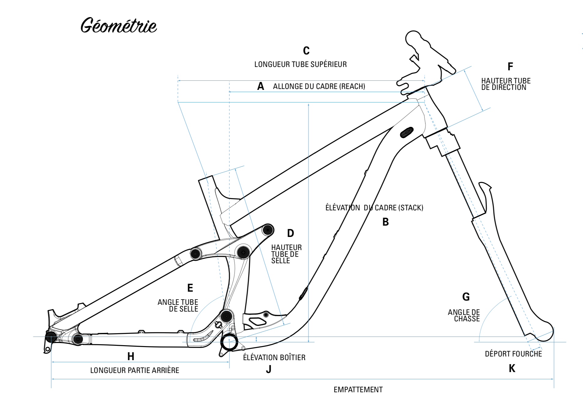 Concrètement, dans les chiffres, cela se traduit par un reach (profondeur du cadre) important, de 450mm en taille M (soit la même valeur que sur un Orbea Rallon en L ou encore 5mm de plus que sur un Specialized Stumpjumper en L, mais 20mm de moins qu’un Mondraker Foxy RR) couplé à une potence en 40mm seulement et à un angle de direction de 64° (65 sur un Rallon, 66,5 sur un Stumpjumper), un angle de selle très droit de 76,8° et des bases courtes de 435mm.