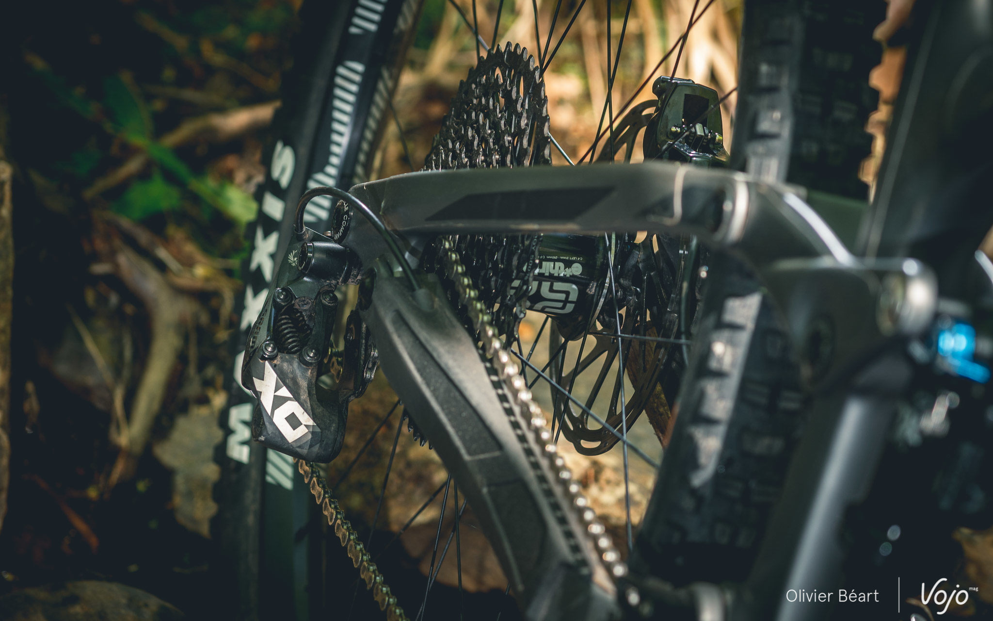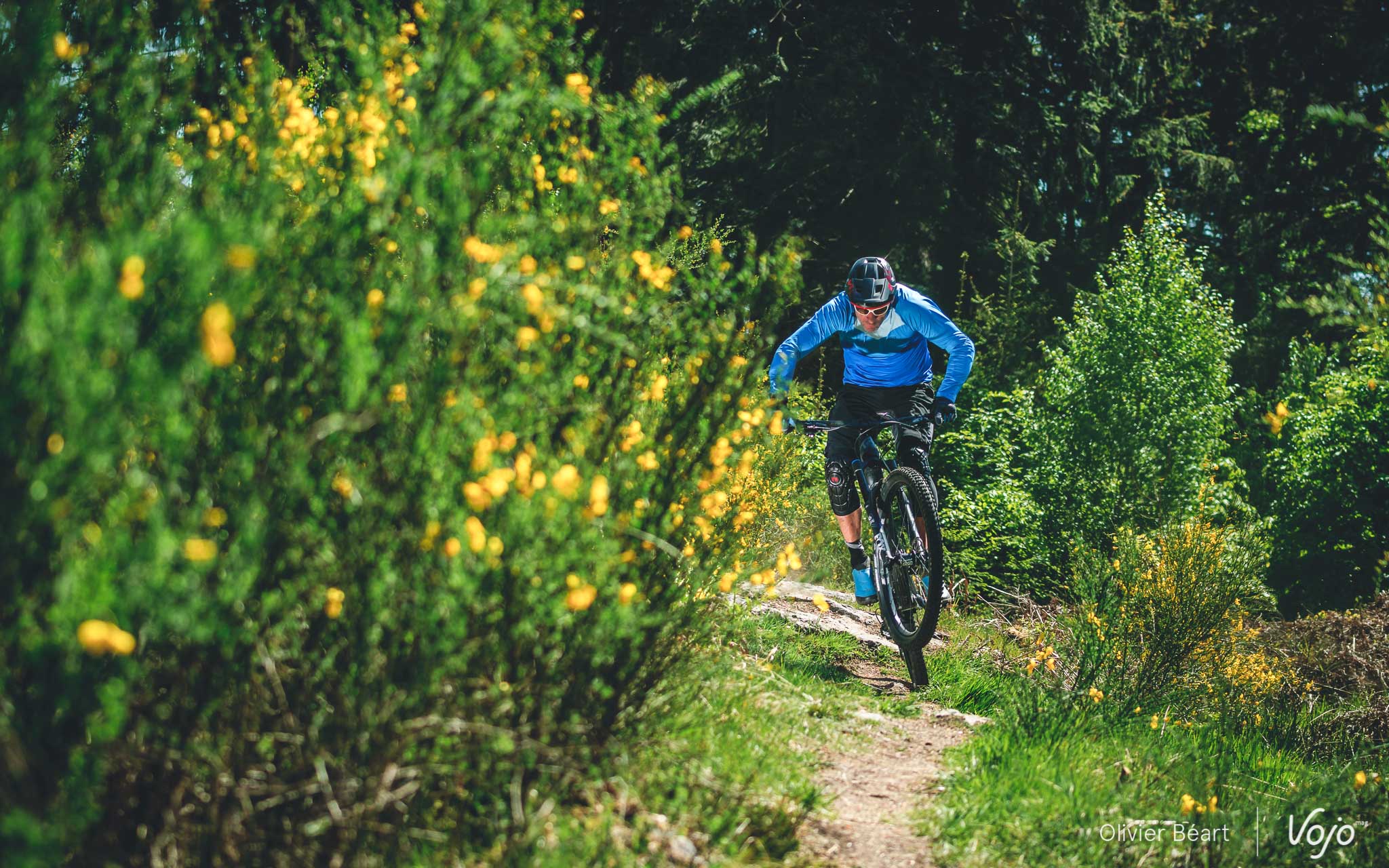 On perçoit immédiatement que le vélo est long, même si avec la potence courte, et le tube de selle très droit, les appuis restent assez familiers. Aux premiers coups de pédales, la suspension réglée avec 25% de SAG comme recommandé se montre comme promis assez neutre tant que le terrain est lisse. On tente une accélération et c’est vrai qu’elle ne pompe pas trop même sans activer la plateforme de l’amortisseur. Par contre, quand on grimpe ou qu’on est sur un chemin plat mais au relief tourmenté, elle a tendance à s’enfoncer rapidement et, comme le boîtier de pédalier est bas, on tape très souvent les manivelles au sol.