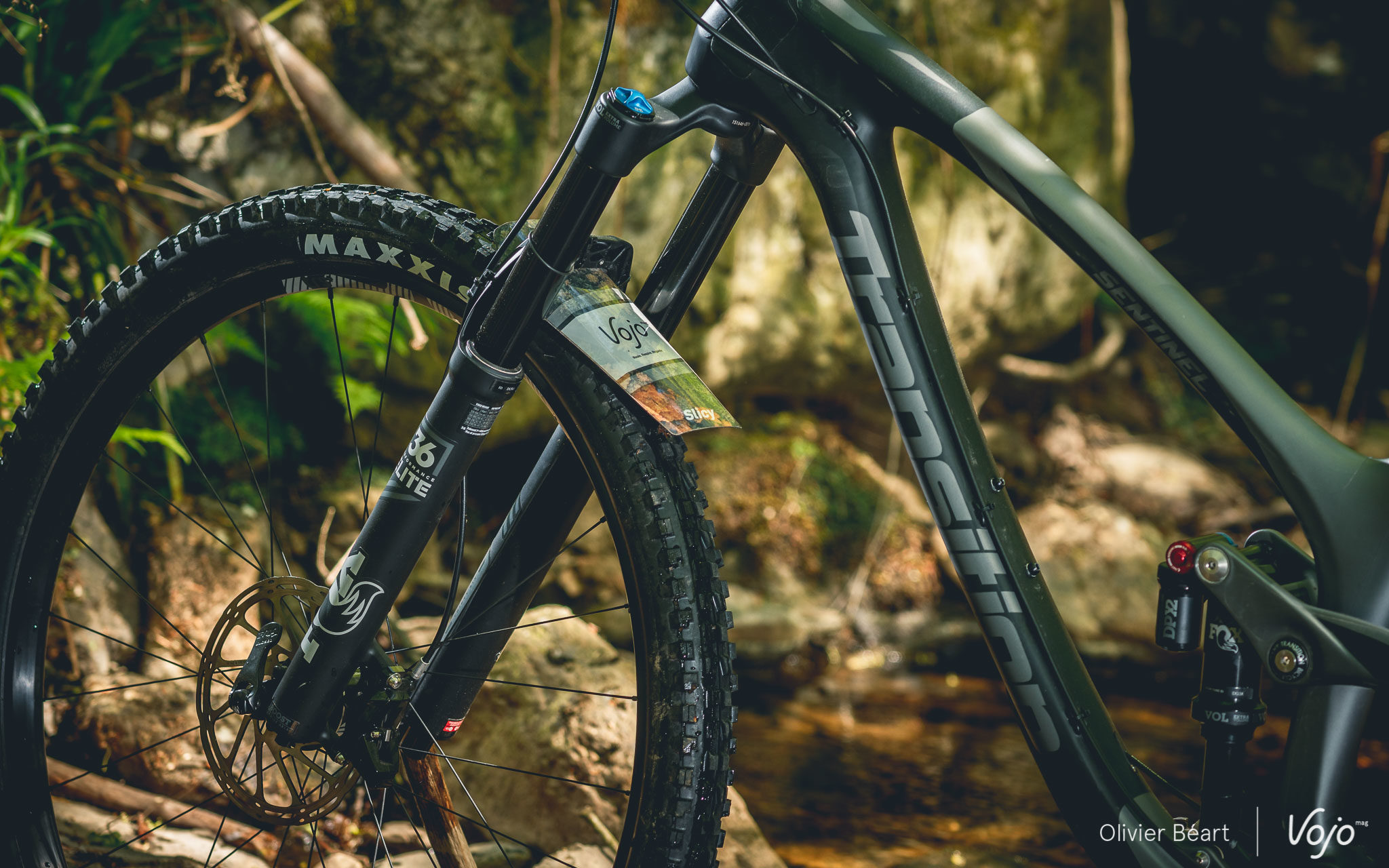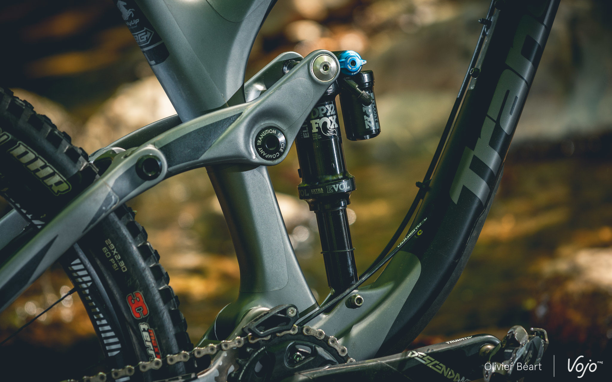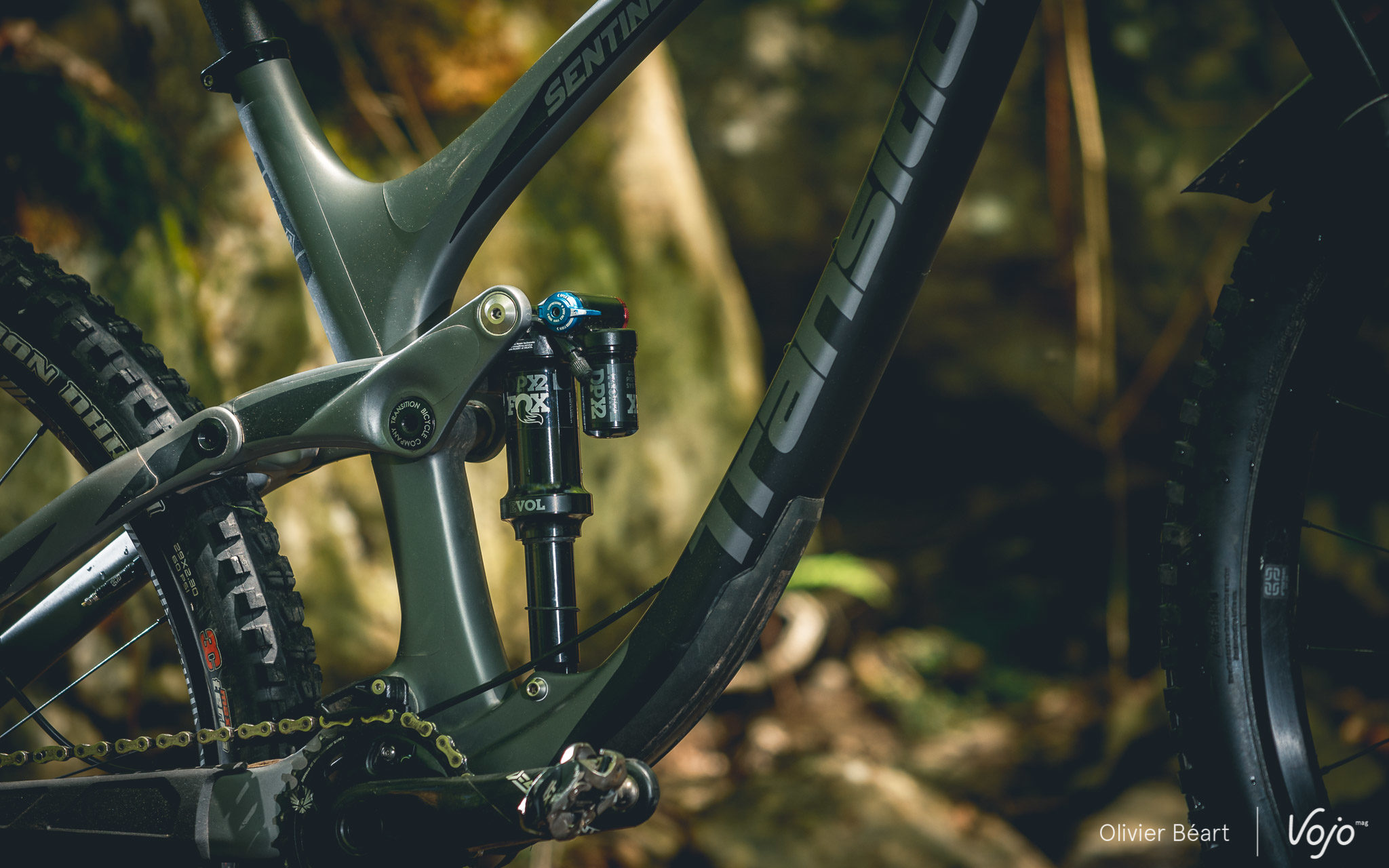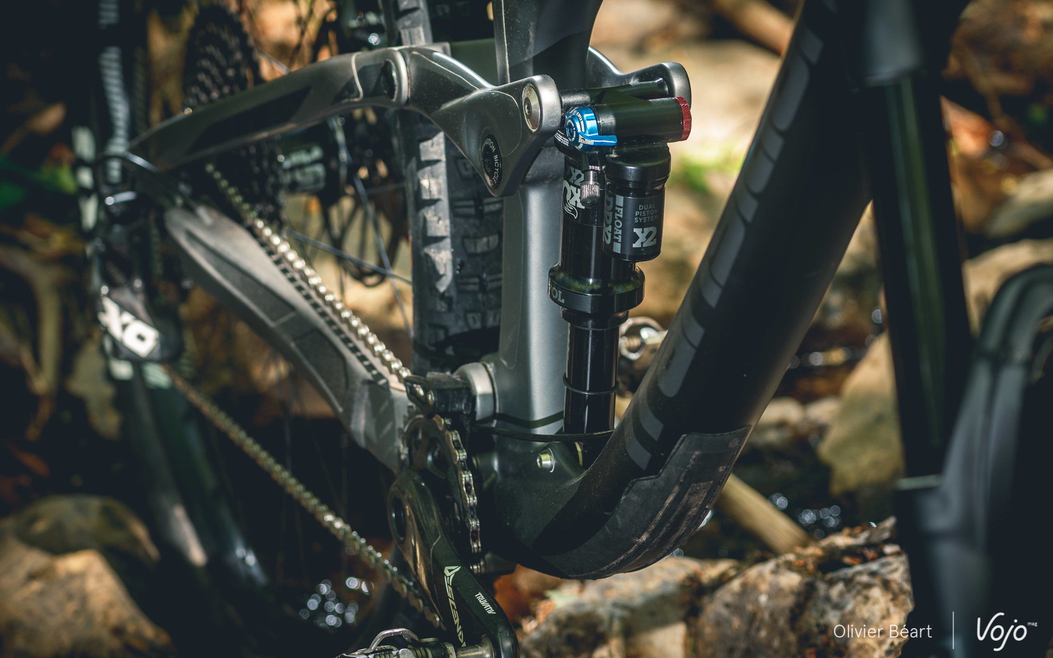 L’amortisseur choisi pour le Transition Sentinel est le Fox Float DPX2 en version Performance (plus d’infos dans notre présentation détaillée : https://dev.vojomag.com/nouveaute-2018-fox-dpx2-la-surprise-du-chef/). Il s’agit du « petit » amortisseur enduro/trail de la marque, qui dispose d’un levier pour durcir la compression (plateforme de pédalage), d’un réglage du rebond et aussi de la possibilité d’ajuster le volume d’air interne au moyen de volume spacers. Ce que nous ne nous sommes pas privés de faire pour mettre le token le plus gros afin de compenser la tendance naturelle de la suspension à plonger un peu trop dans le débattement. Nous en reparlerons un peu plus loin lors de l’essai terrain. Il est en mesure métrique et utilise une monte type Trunion sur le haut (vis plus grosses fixées directement dans l’amortisseur et pas de spacers pour récupérer l’espace séparant la fixation de la biellette) pour plus de rigidité, et sachez que le montage d’un amortisseur à ressort ou à air plus gros (type Float X2) est tout à fait possible car ce n’est pas la place qui manque.