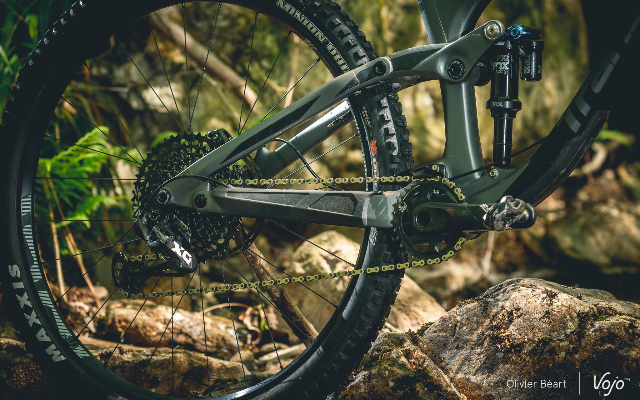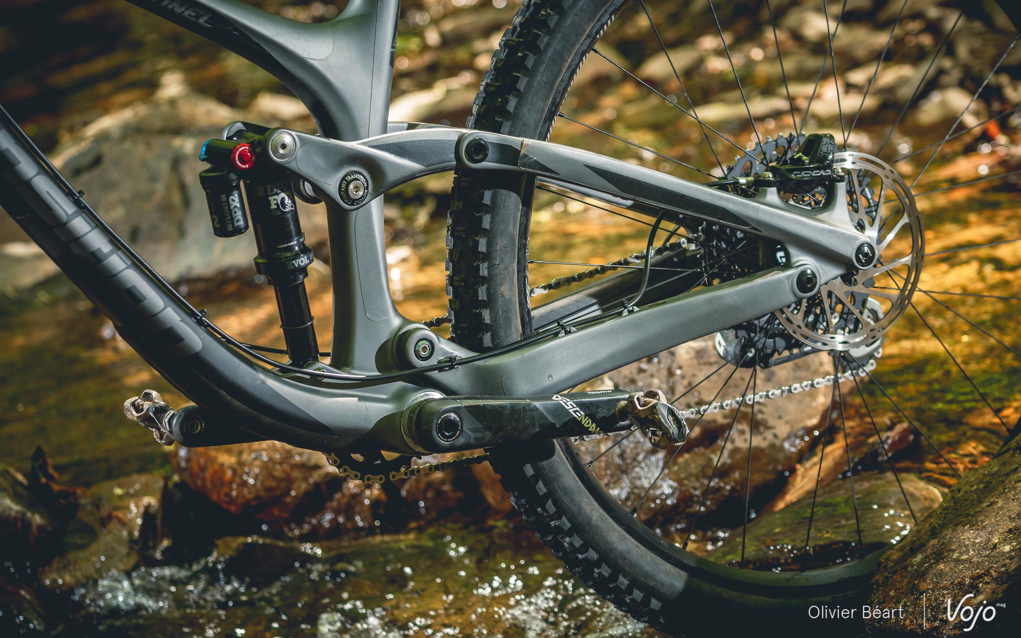 Sur papier, ce type de cinématique est censée offrir une bonne sensibilité sur les petits chocs, mais aussi un bon maintien sur le reste du débattement. Transition a fait le choix de limiter la valeur d’allongement de la chaîne, qui est le plus élevé au point de SAG, mais qui diminue très fortement quand on s’enfonce dans le débattement. De quoi jouer la carte de la traction en côte et éviter que la tension de chaîne n’influence négativement le travail de la suspension.