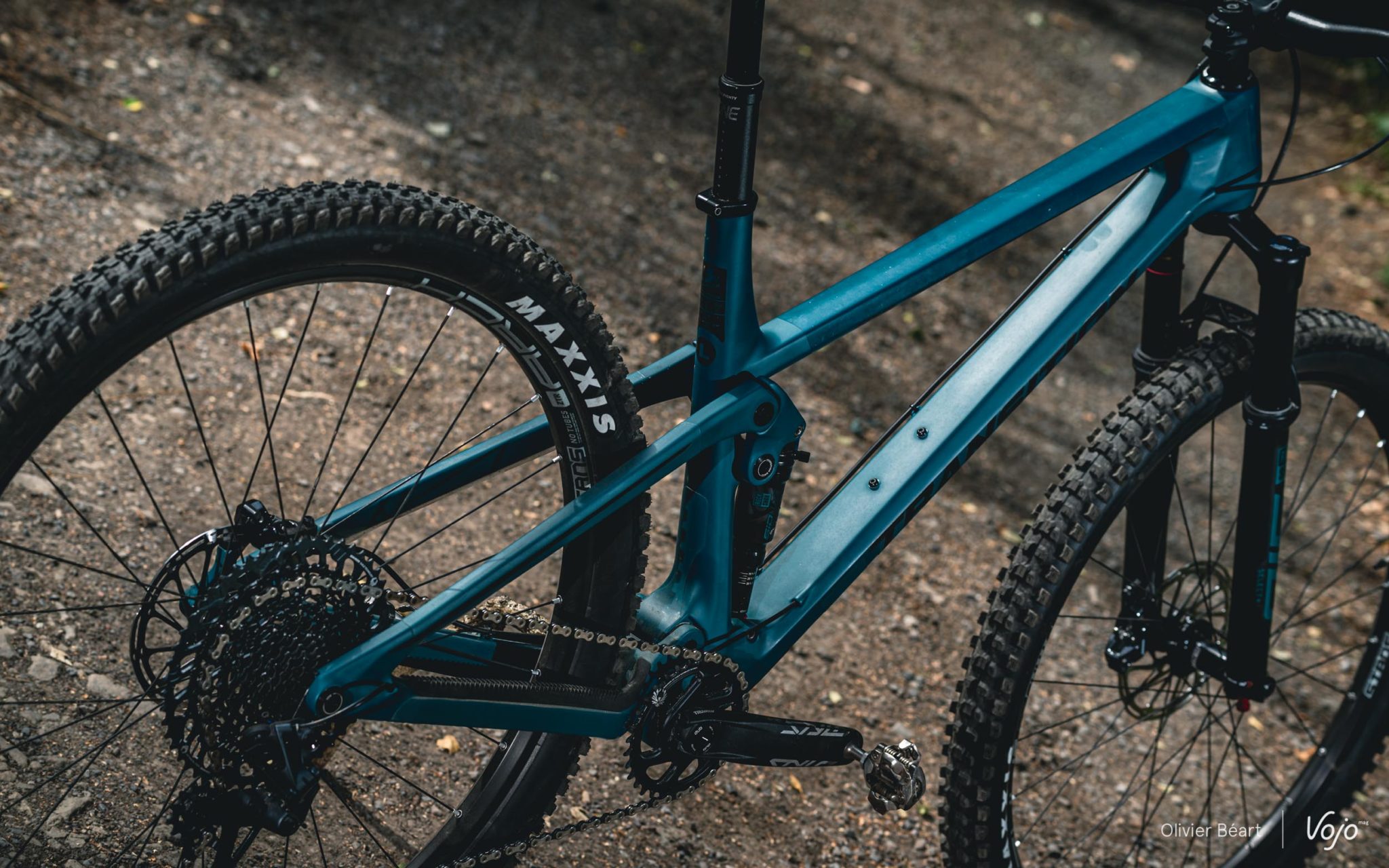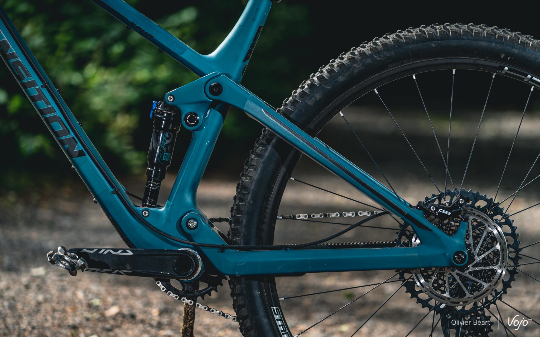 Si, d’origine, le débattement est de 120mm, il est possible de le réduire à 100mm. Pour cela, il faudra changer l’amortisseur monté d’origine par un autre à course plus courte. Depuis l’arrivée des amortisseurs au format métrique, la plupart des modèles sont en effet disponibles avec plusieurs courses de piston pour une même longueur totale d’amortisseur entre ses deux points d’ancrage. Ici, d’origine, on a donc un RockShox SID Luxe en 190mm de long pour 45mm de course au piston, qu’il est possible de remplacer par un 190*37,5mm si on souhaite réduire le débattement. Il n’y a pas de blocage au cintre, et celui-ci ne nous a pas vraiment manqué. Par contre, même si l’amortisseur est bien accessible sur ce vélo, carton rouge pour le réglage du rebond qui nécessite une clé Allen sur l’amortisseur !