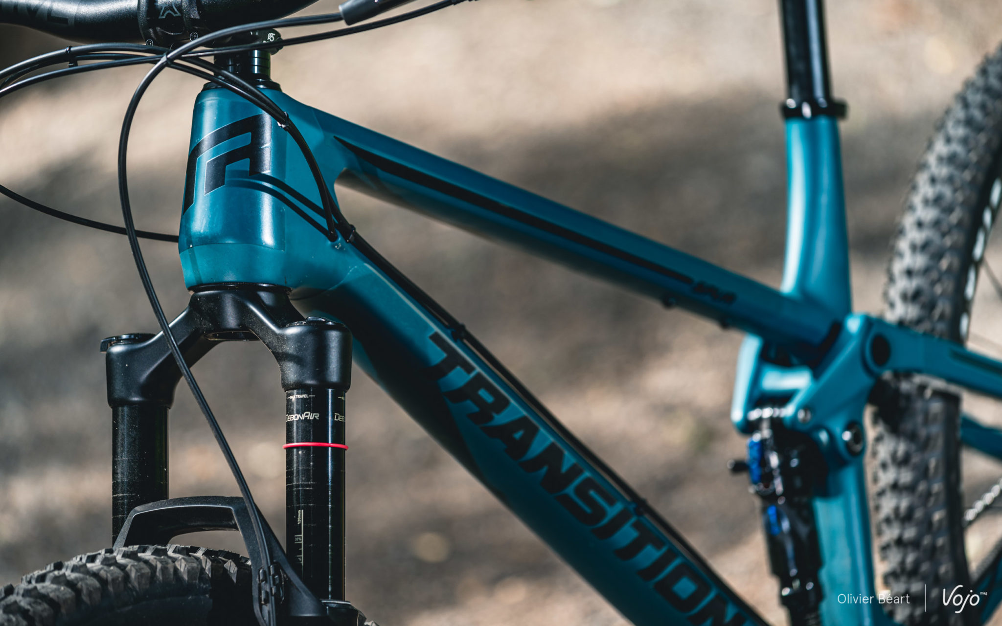 Transition appelle son concept de géométrie « SBG » pour Speed Balanced Geometry. L’idée est de garder un vélo agile à basse vitesse, avec une roue avant qui garde bien le grip, mais qui met aussi le pilote en confiance dans les fortes pentes ou quand la vitesse augmente. Bon, en clair, on va retrouver un angle de direction généreusement couché pour la catégorie (66°), combiné à une fourche à déport court ; un angle de selle plutôt redressé (76,2°) et un cadre plutôt profond avec un reach de 480mm en taille L. Les bases sont bien courtes, avec 435mm, ce qui est remarquable pour un tout suspendu 29″.