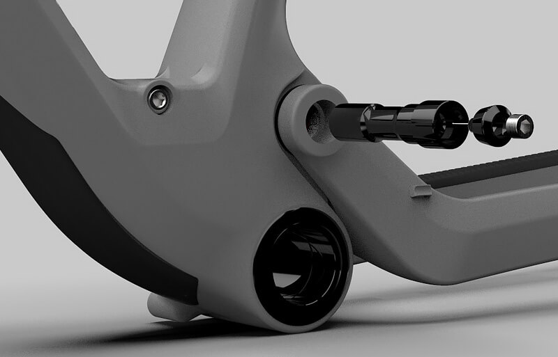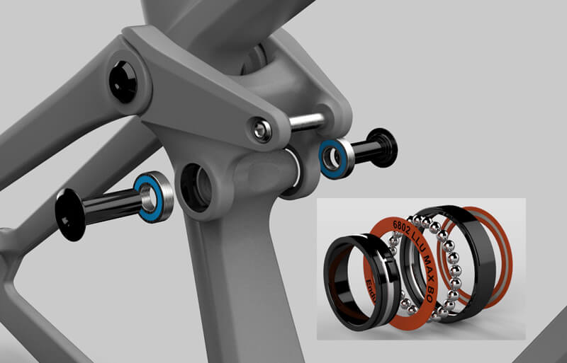 Les différents points de pivot sont montés sur des roulements Enduro Max et le point de pivot principal « à collet » permet d’éviter tout desserrage intempestif, tout en protégeant mieux les roulements ; ces derniers étant situés dans le cadre et non sur le bras arrière pour un maximum de protection.
