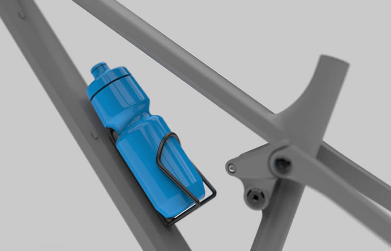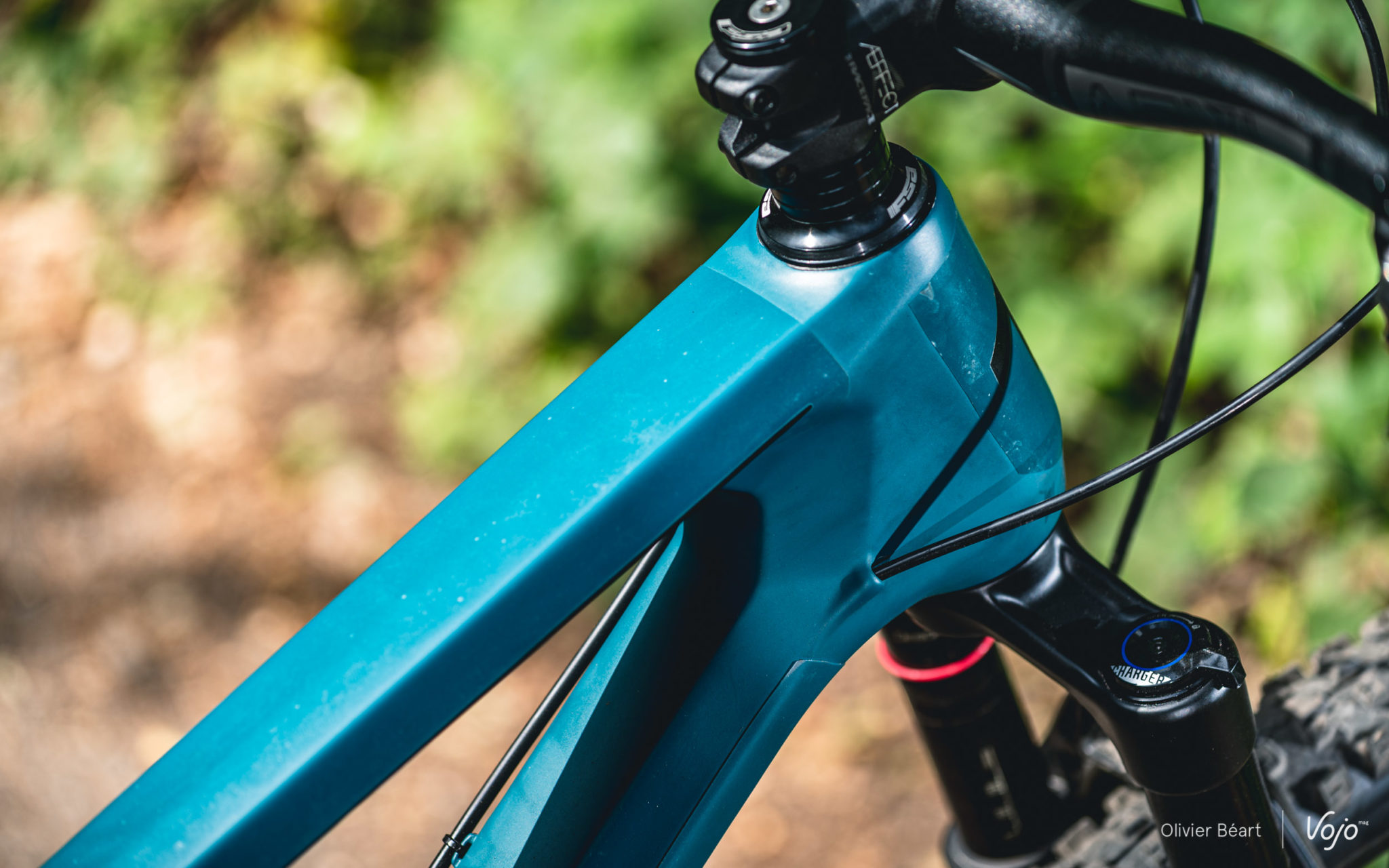 Enfin, les tubes droits et le triangle avant très long dégagent un grand espace à l’intérieur du cadre, de sorte qu’il est possible de mettre un grand bidon de 750ml sur le tube diagonal. La suspension empêche de mettre un second porte-bidon sur le tube de selle, mais on trouve deux pas de vis sous le tube supérieur. Ceux-ci permettent soit de fixer un système d’accroche pour un kit de réparation, soit un mini bidon type Fidlock. C’est une alternative plus visible mais finalement aussi pratique à la « box » qu’on trouve dans les tubes de certains Specialized ou Trek.