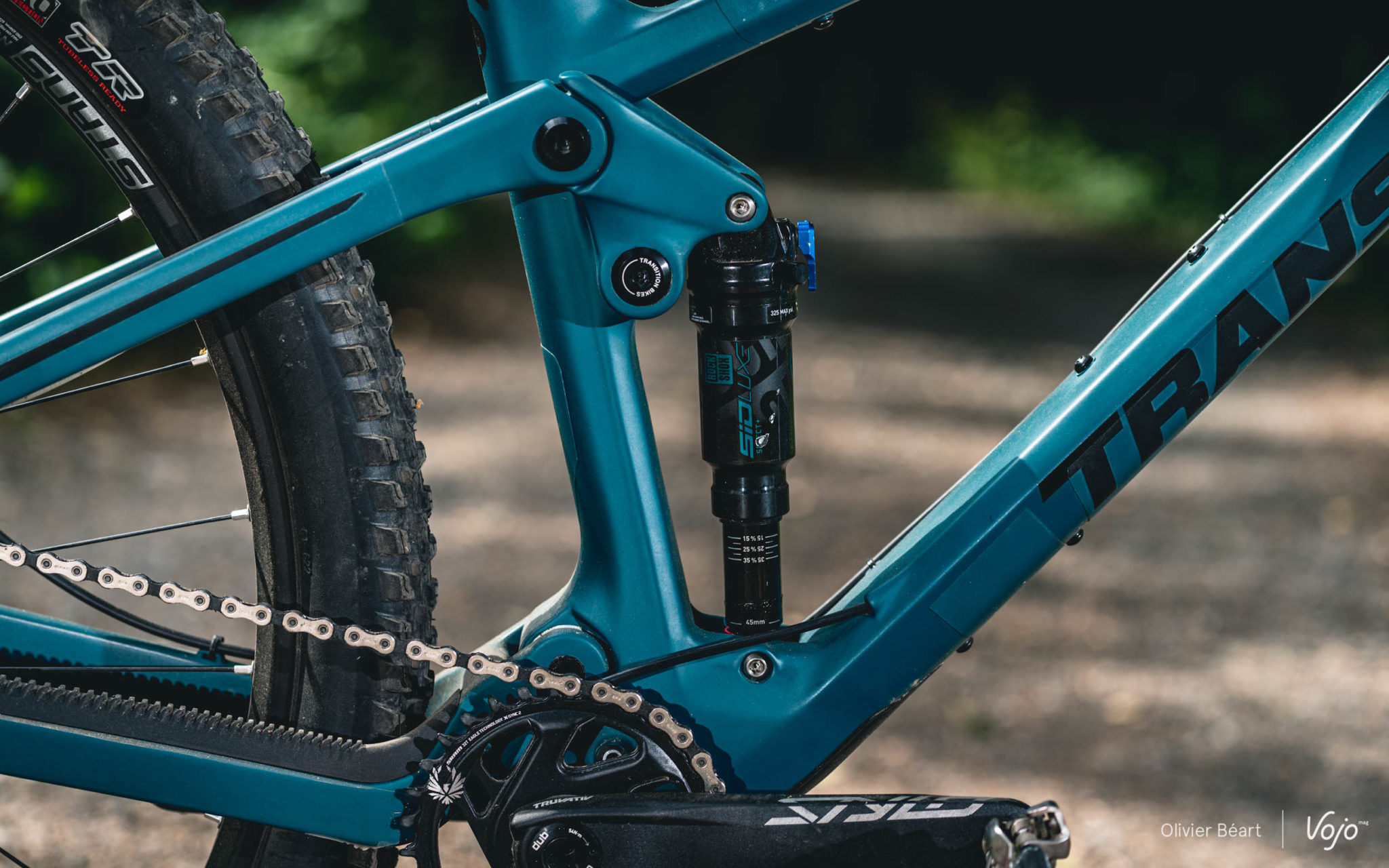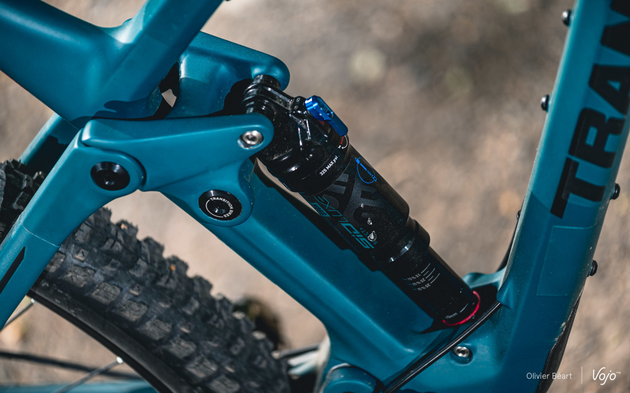 Le Transition Spur emploie une cinématique de suspension assez simple et connue : un mono-pivot à biellette. Il diffère en cela de ses grands frères qui, malgré la ressemblance visuelle, utilisent bien un principe différent, puisqu’il s’agit d’un four bar linkage avec pivot Horst Link sur les bases. Ici, sur le Spur, pas de pivot sur roulements, mais une zone de flexion du carbone au niveau des haubans.