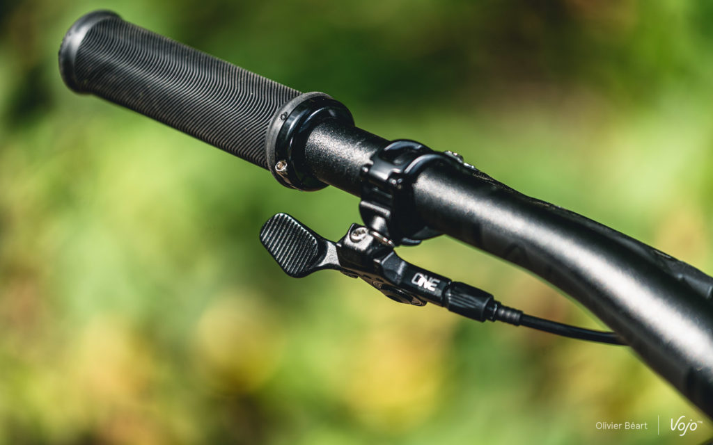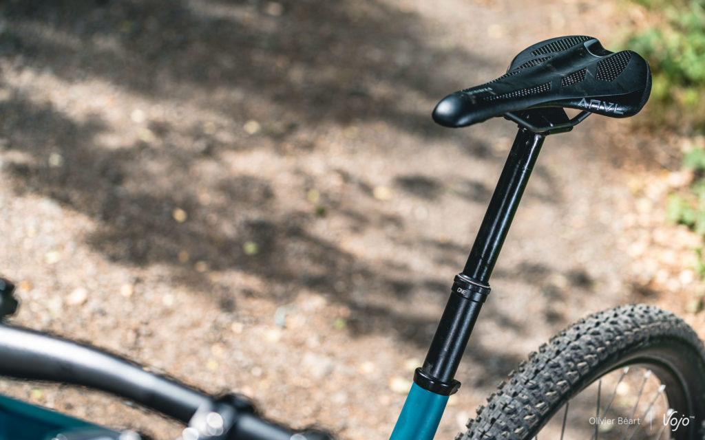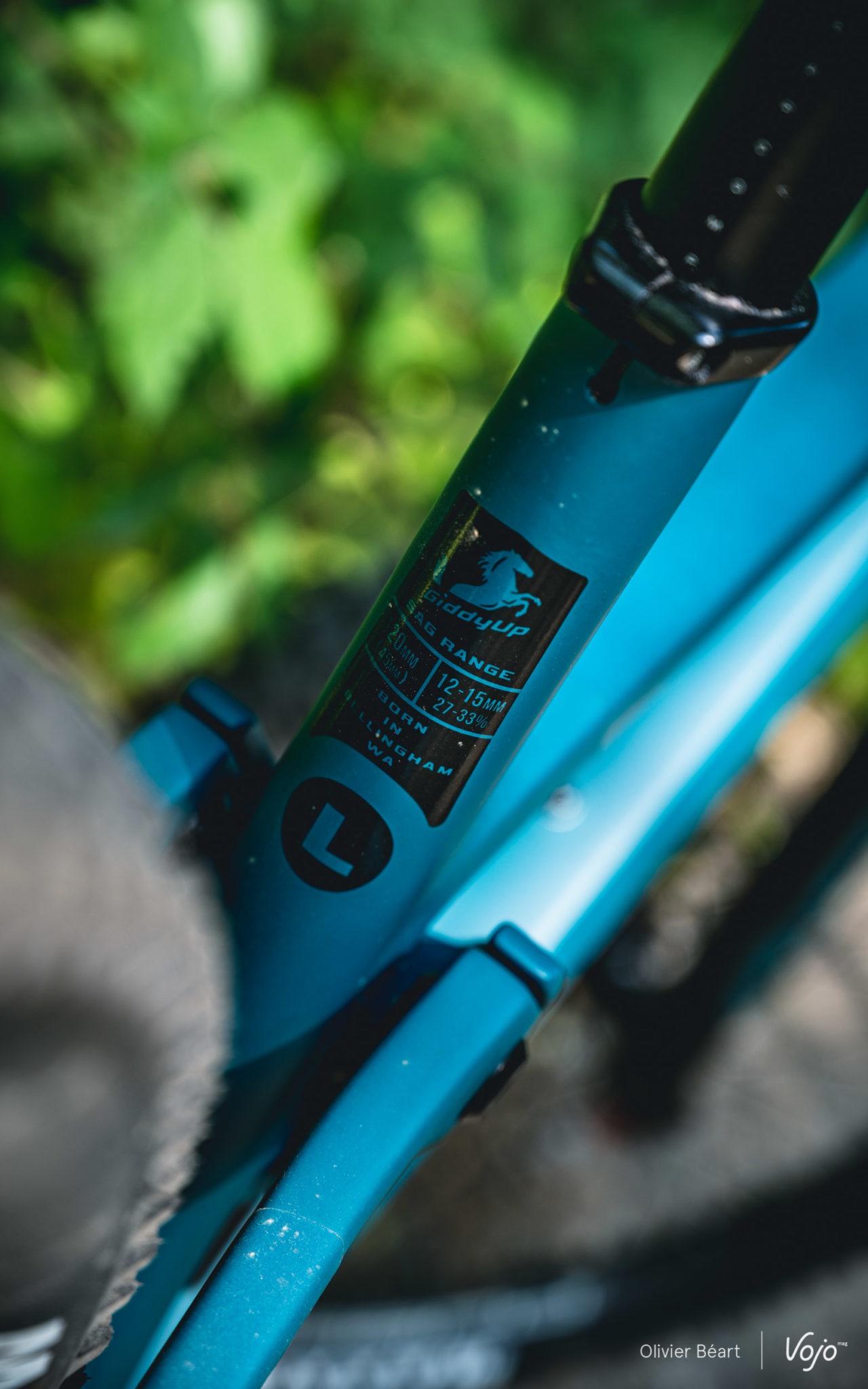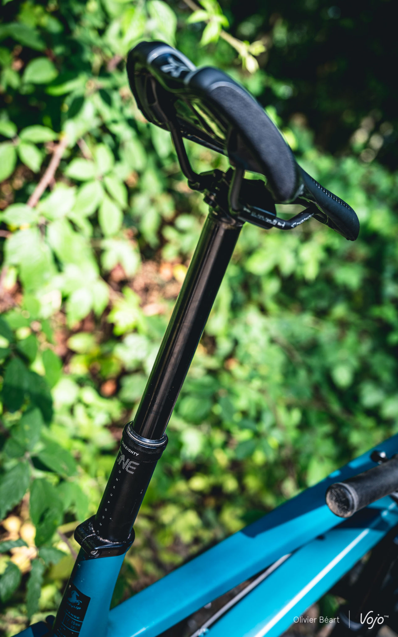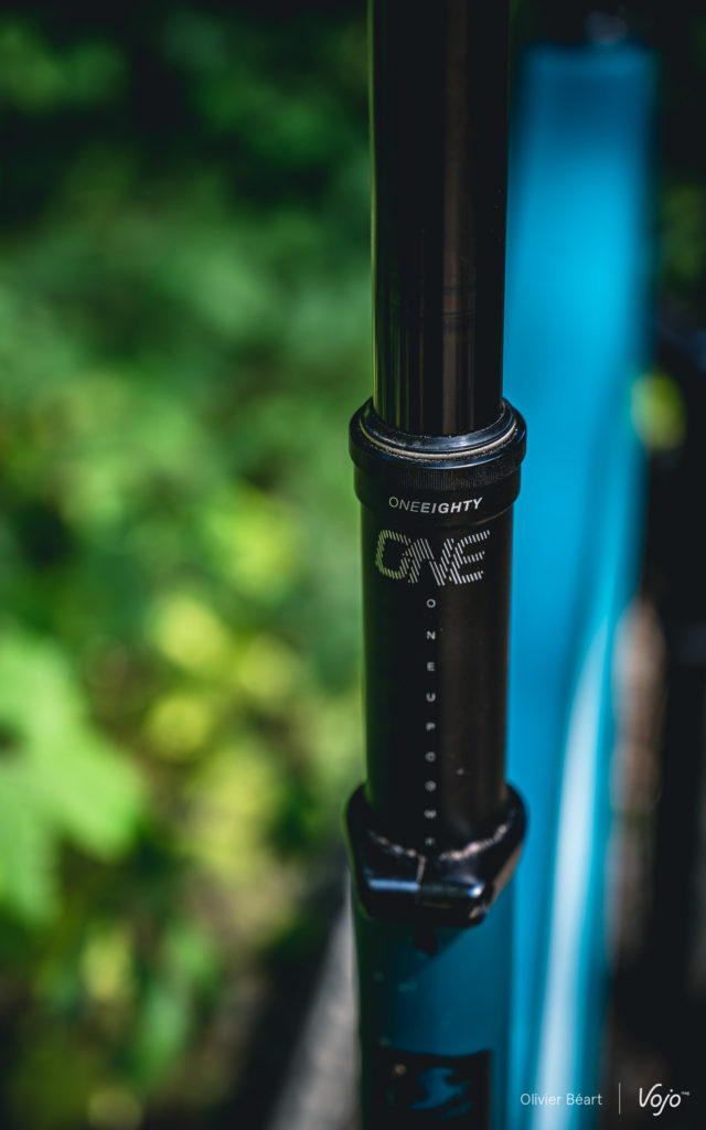 Enfin, on termine par la tige de selle OneUp en 180mm de débattement. Il est rare de disposer d’autant de course sur un « petit vélo » mais, comme vous le verrez plus loin, nous avons beaucoup apprécié. Transition a fait en sorte que le tube de selle du Spur soit parfaitement droit, de sorte qu’on puisse y insérer même les tiges de selle télescopiques les plus longues sans aucun souci et en pouvant les enfoncer au plus bas. Quant au modèle OneUp, il nous a séduits par son fonctionnement et la douceur ainsi que l’ergonomie de sa commande.
