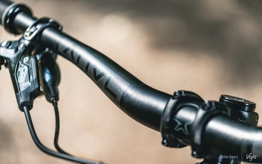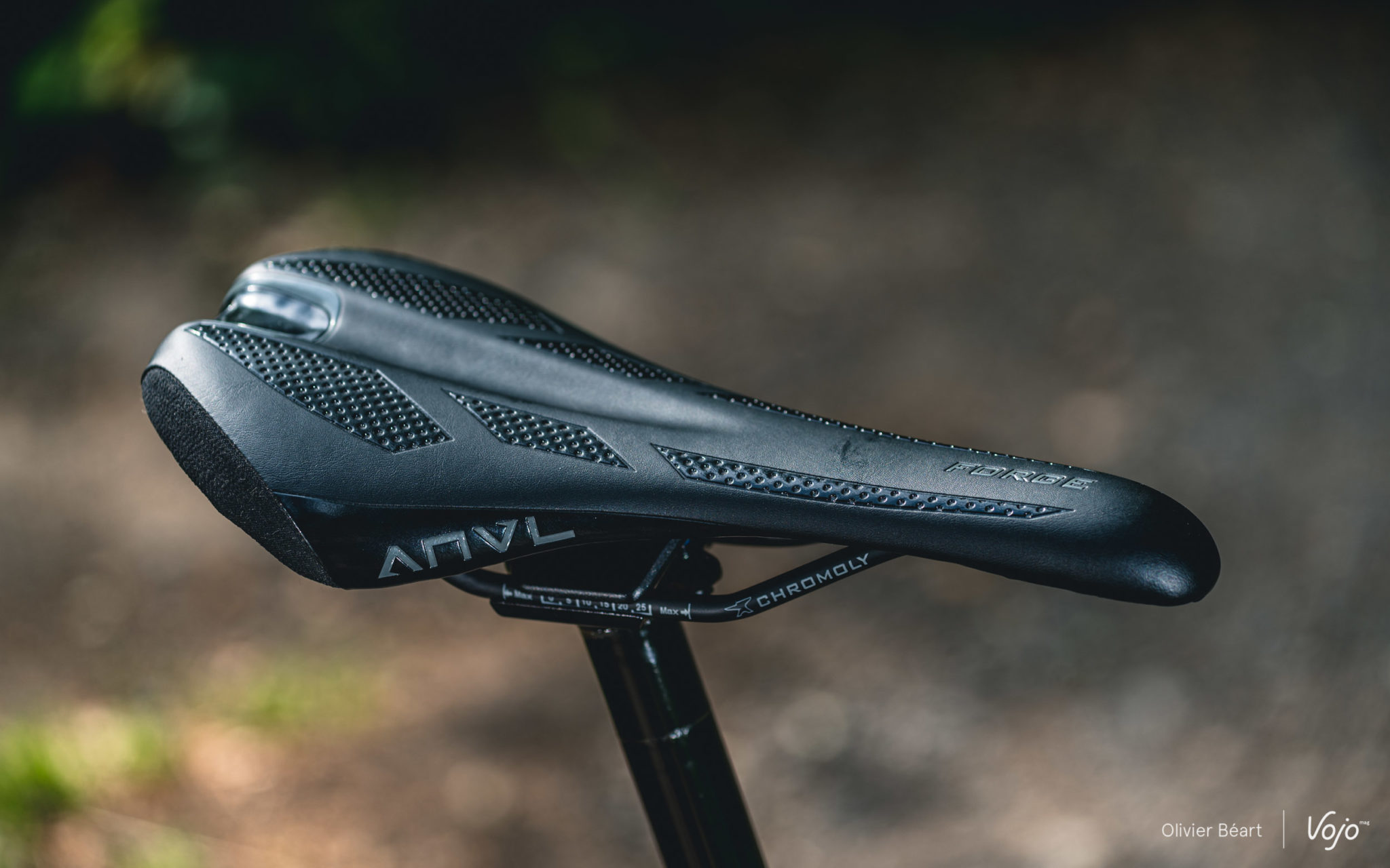 Les périphériques sont signés Anvl. Rien à redire, c’est propre et net. Sans grande originalité, mais la finition est belle et le look épuré s’accorde bien avec le vélo. Un mot tout de même sur le cintre relevé : il se marie bien à ce châssis et ne dénature pas la position, mais on pourra aussi imaginer un cintre plat sans souci. Par contre, le 35mm de diamètre n’est pas indispensable selon nous et un retour au 31,8mm, plus tolérant, ne serait pas pour nous déplaire, pas plus qu’un passage sur du carbone qui filtre un peu plus les vibrations.