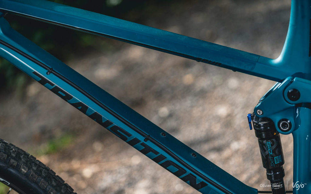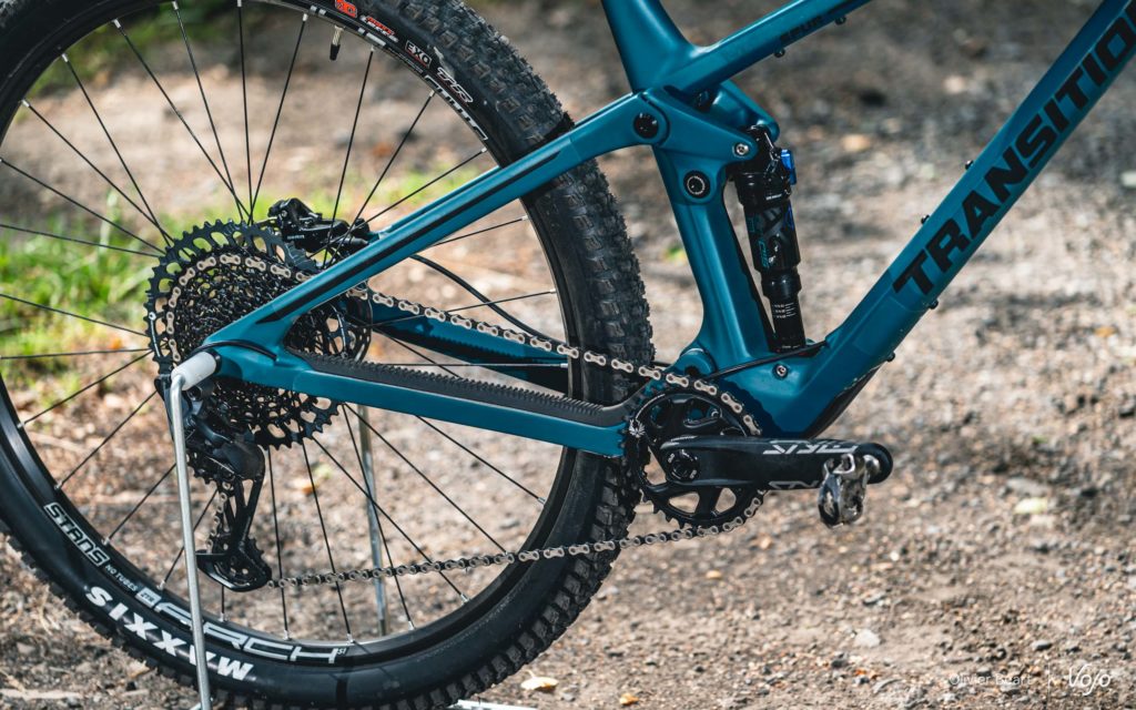 Transition appelle son concept de géométrie « SBG » pour Speed Balanced Geometry. L’idée est de garder un vélo agile à basse vitesse, avec une roue avant qui garde bien le grip, mais qui met aussi le pilote en confiance dans les fortes pentes ou quand la vitesse augmente. Bon, en clair, on va retrouver un angle de direction généreusement couché pour la catégorie (66°), combiné à une fourche à déport court ; un angle de selle plutôt redressé (76,2°) et un cadre plutôt profond avec un reach de 480mm en taille L. Les bases sont bien courtes, avec 435mm, ce qui est remarquable pour un tout suspendu 29″.