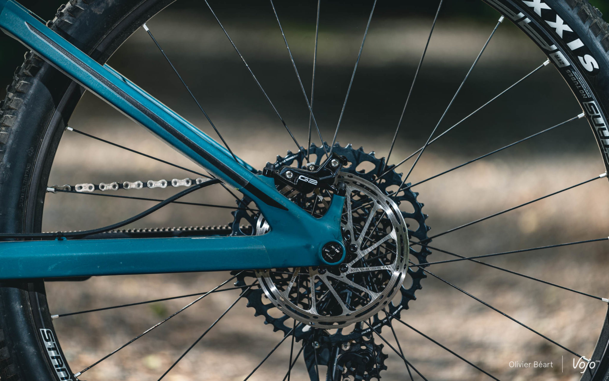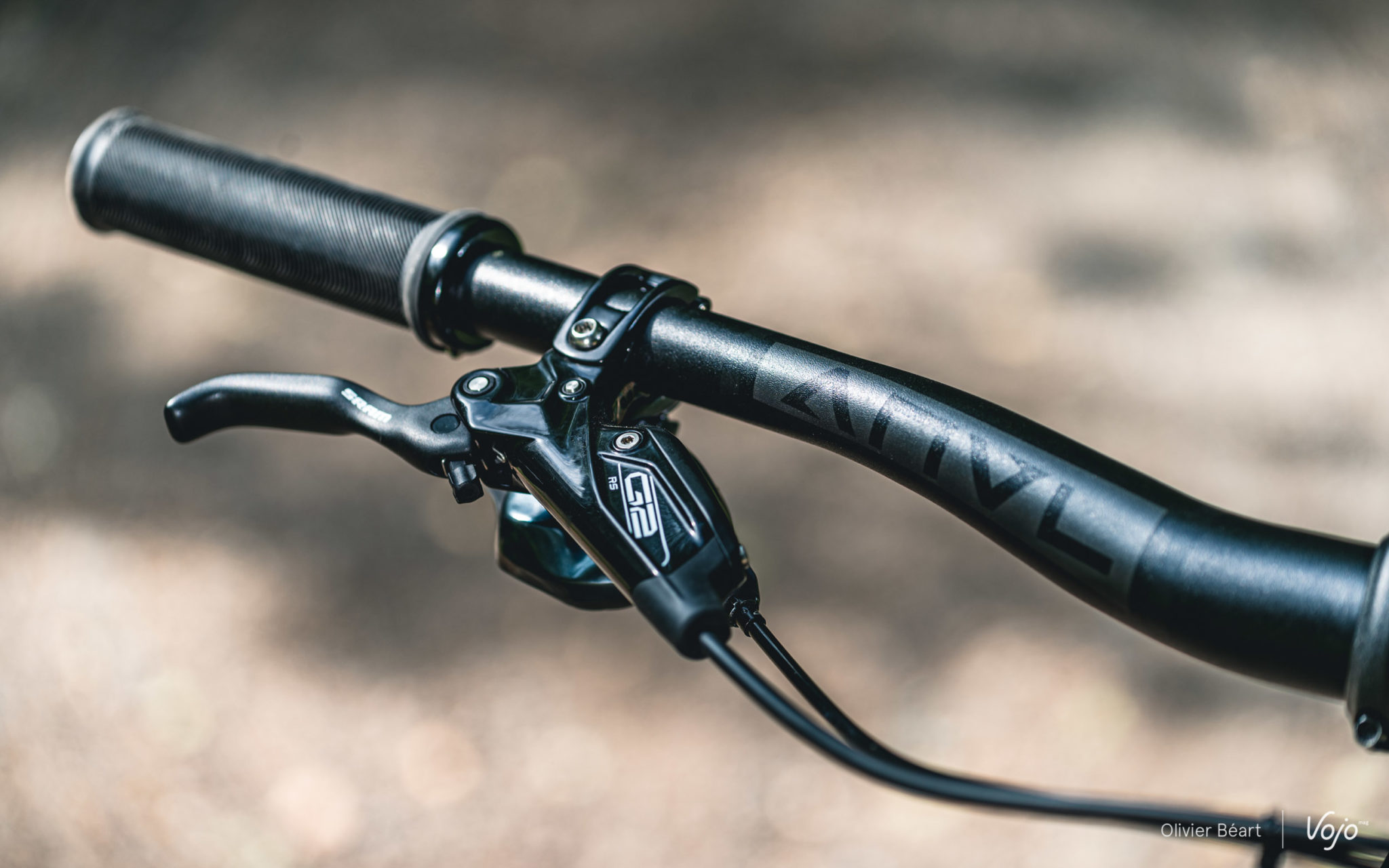 Les freins sont bien des 4 pistons, plus adaptés que des 2 pistons sur ce genre de vélo. Il s’agit des Sram G2 ; pas les plus puissants mais ils collent selon nous assez bien au programme de la machine. Nos testeurs sont assez légers et nous avons testé le vélo en Belgique, où nous avons de belles descentes raides mais pas très longues. Pour des pilotes plus lourds et des reliefs plus prononcés, il faudra sans doute envisager aussi de faire passer le disque arrière de 160 à 180mm, et éventuellement l’avant en 200mm.