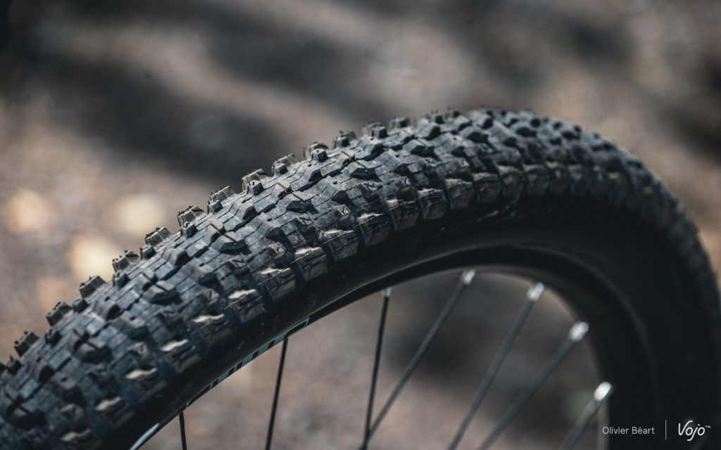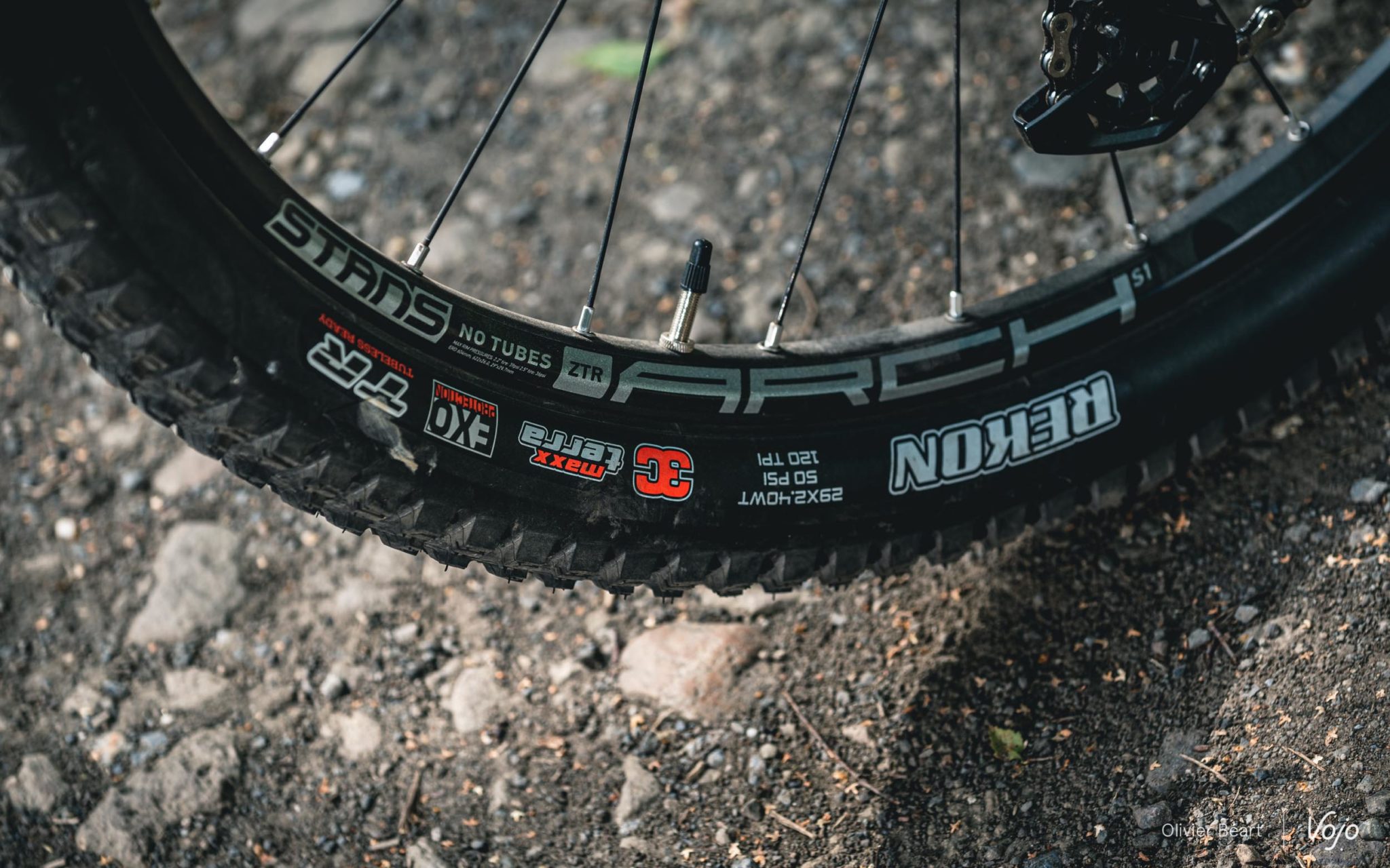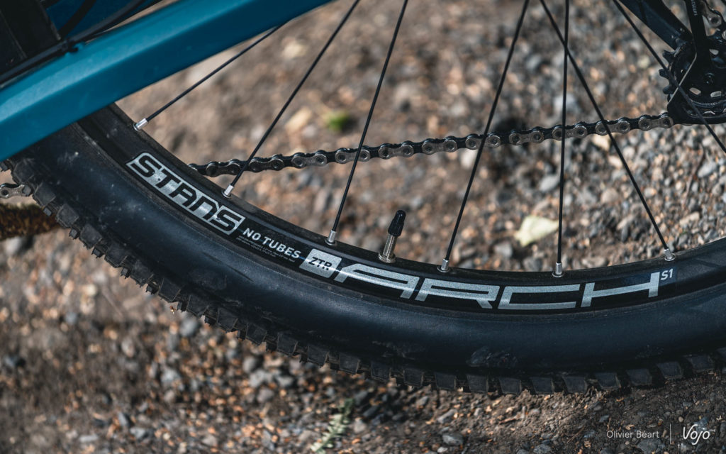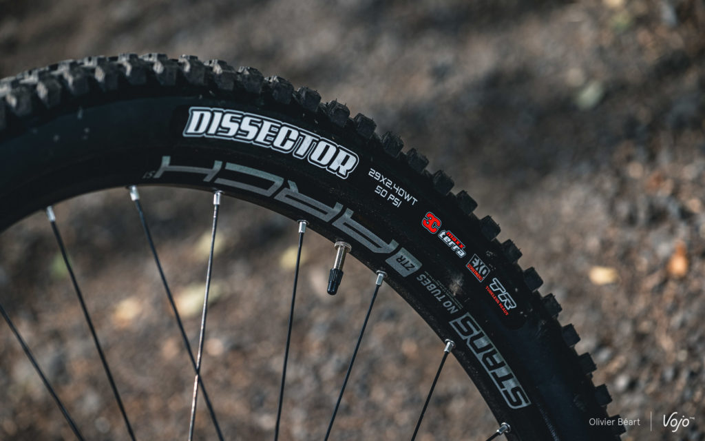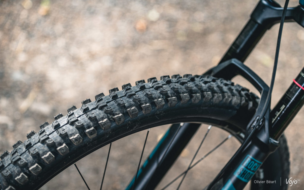 Au niveau des roues, Transition fait confiance à NoTubes avec les Arch S1. Il s’agit de la série la plus accessible de chez NoTubes, et les Arch offrent une largeur entre crochets de 26mm ; un peu en dessous des tendances qui vont de plus en plus vers le 30mm de large pour ce genre de vélo. Les pneus proviennent de chez Maxxis avec le Rekon, excellent en traction et au freinage pour l’arrière, combiné au Dissector, un petit nouveau parfait pour l’avant sur ce genre de vélo. Tous deux sont en 2.4 de section et carcasse Exo, ce qui colle bien, tout comme les profils choisis, à un usage engagé et plutôt typé descendant du Spur. Pour un usage qui lorgne plus vers le XC, d’autres roues et des pneus issus des gammes XC (comme les nouveaux Wide Trail XC de Maxxis en 2.4 toujours, ou les Schwalbe Racing Ralph/Ray en 2.35) seront plus adaptés.
