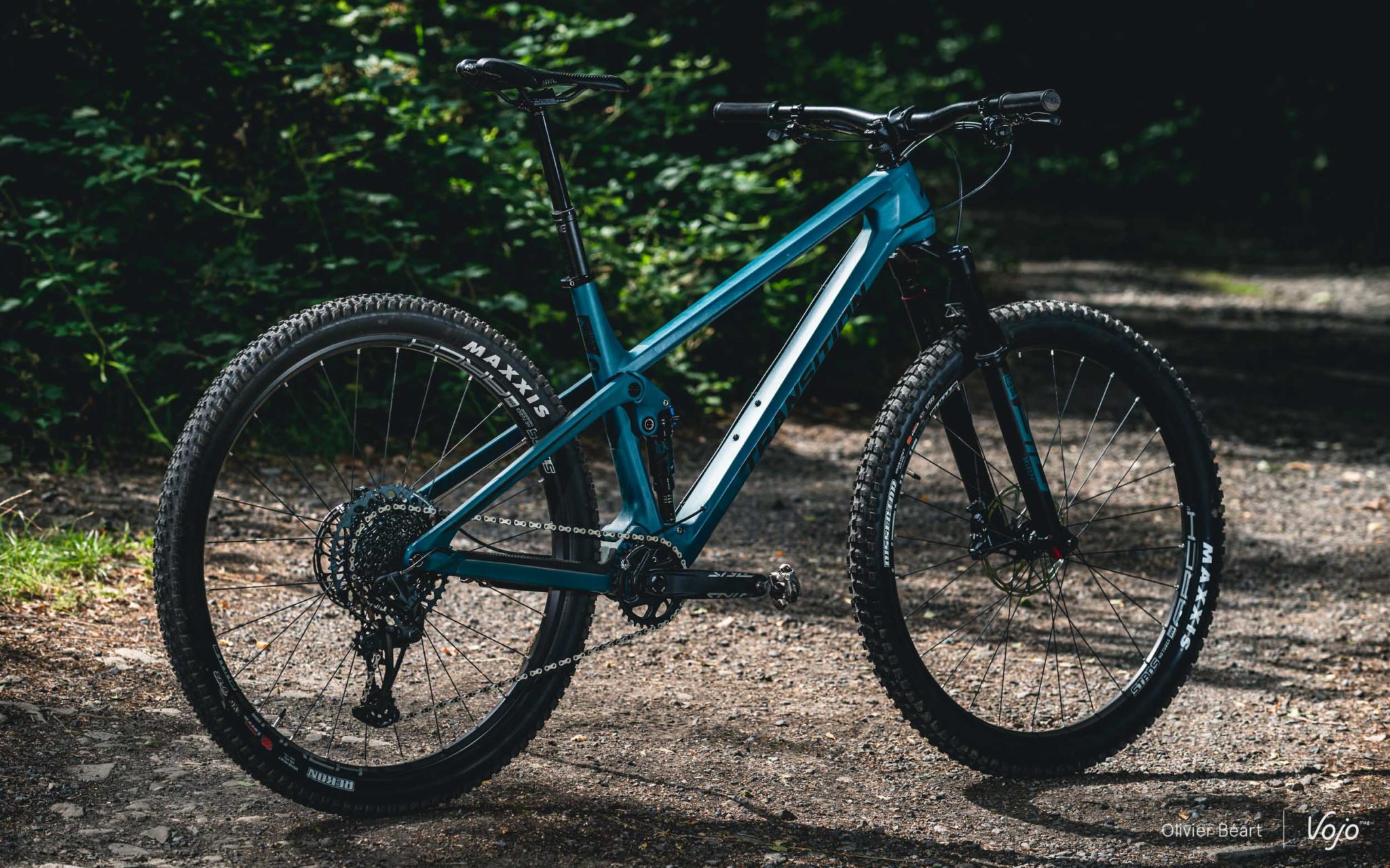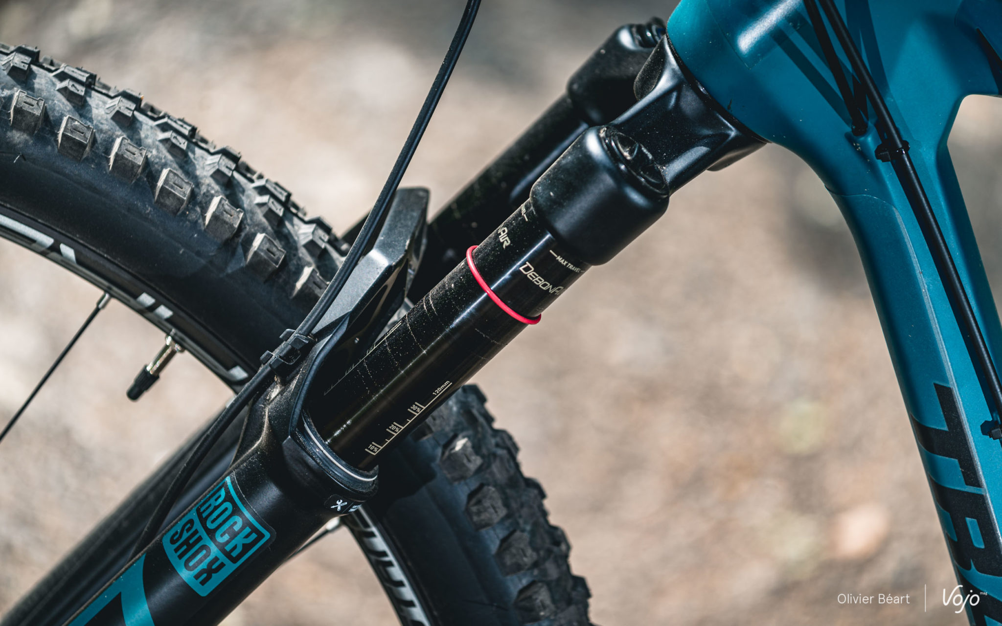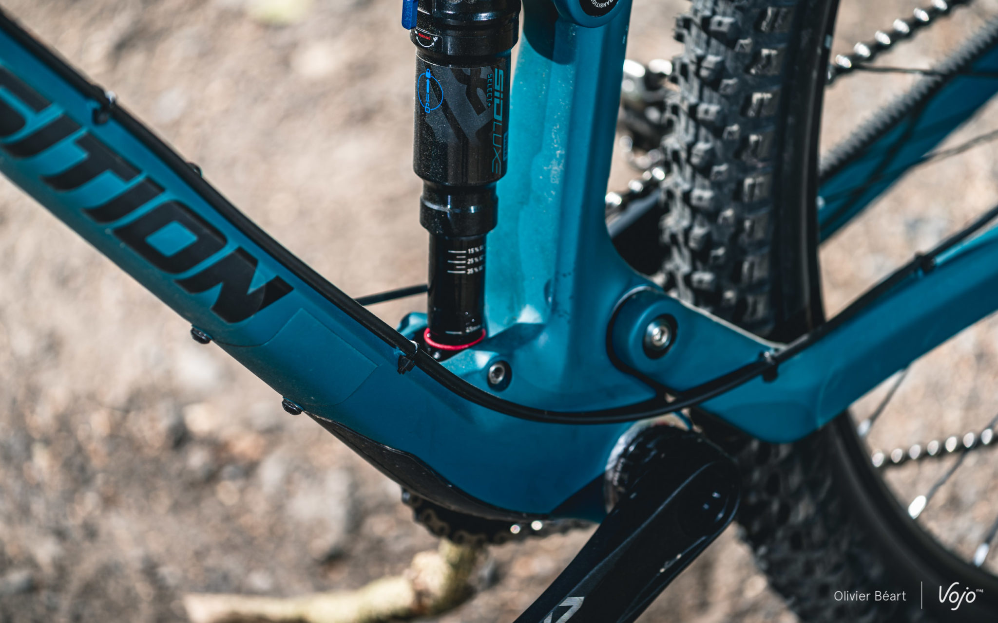 Si, d’origine, le débattement est de 120mm, il est possible de le réduire à 100mm. Pour cela, il faudra changer l’amortisseur monté d’origine par un autre à course plus courte. Depuis l’arrivée des amortisseurs au format métrique, la plupart des modèles sont en effet disponibles avec plusieurs courses de piston pour une même longueur totale d’amortisseur entre ses deux points d’ancrage. Ici, d’origine, on a donc un RockShox SID Luxe en 190mm de long pour 45mm de course au piston, qu’il est possible de remplacer par un 190*37,5mm si on souhaite réduire le débattement. Il n’y a pas de blocage au cintre, et celui-ci ne nous a pas vraiment manqué. Par contre, même si l’amortisseur est bien accessible sur ce vélo, carton rouge pour le réglage du rebond qui nécessite une clé Allen sur l’amortisseur !