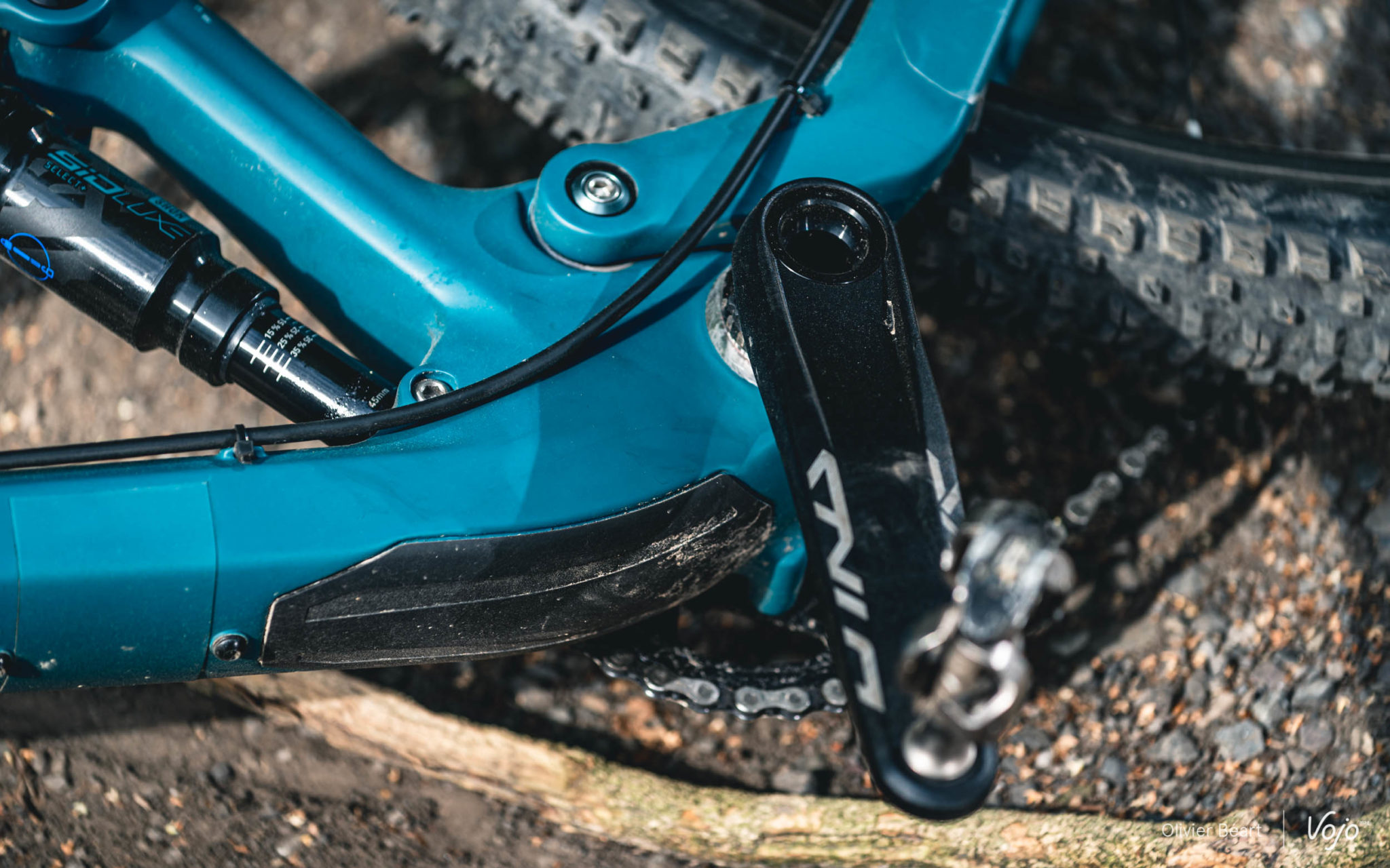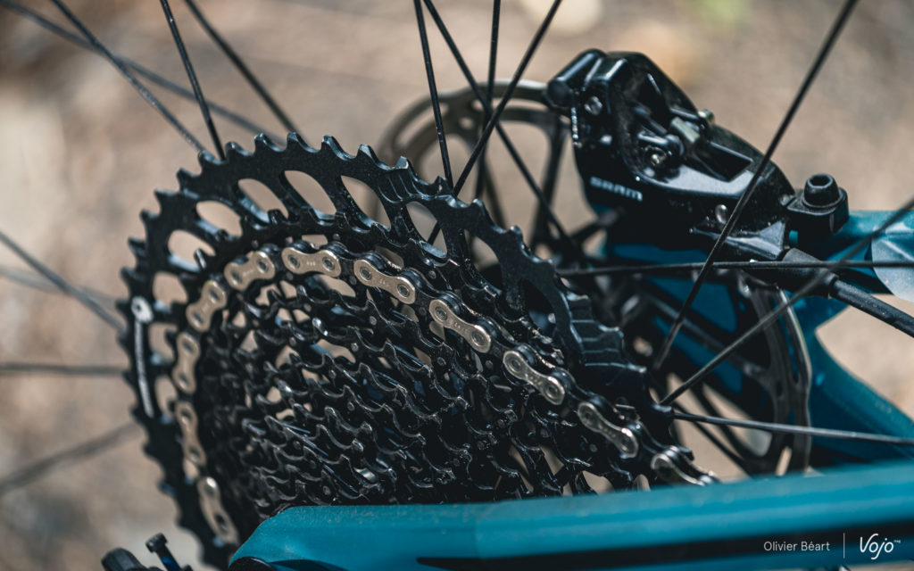 Du côté de la transmission, on retrouve le nouveau groupe Sram GX Eagle avec sa cassette 10-52 qui colle particulièrement bien avec la polyvalence de l’engin (plus d’infos sur ce groupe ici). le pédalier reste quant à lui en alu et non en carbone (option désormais disponible sur le groupe GX).
