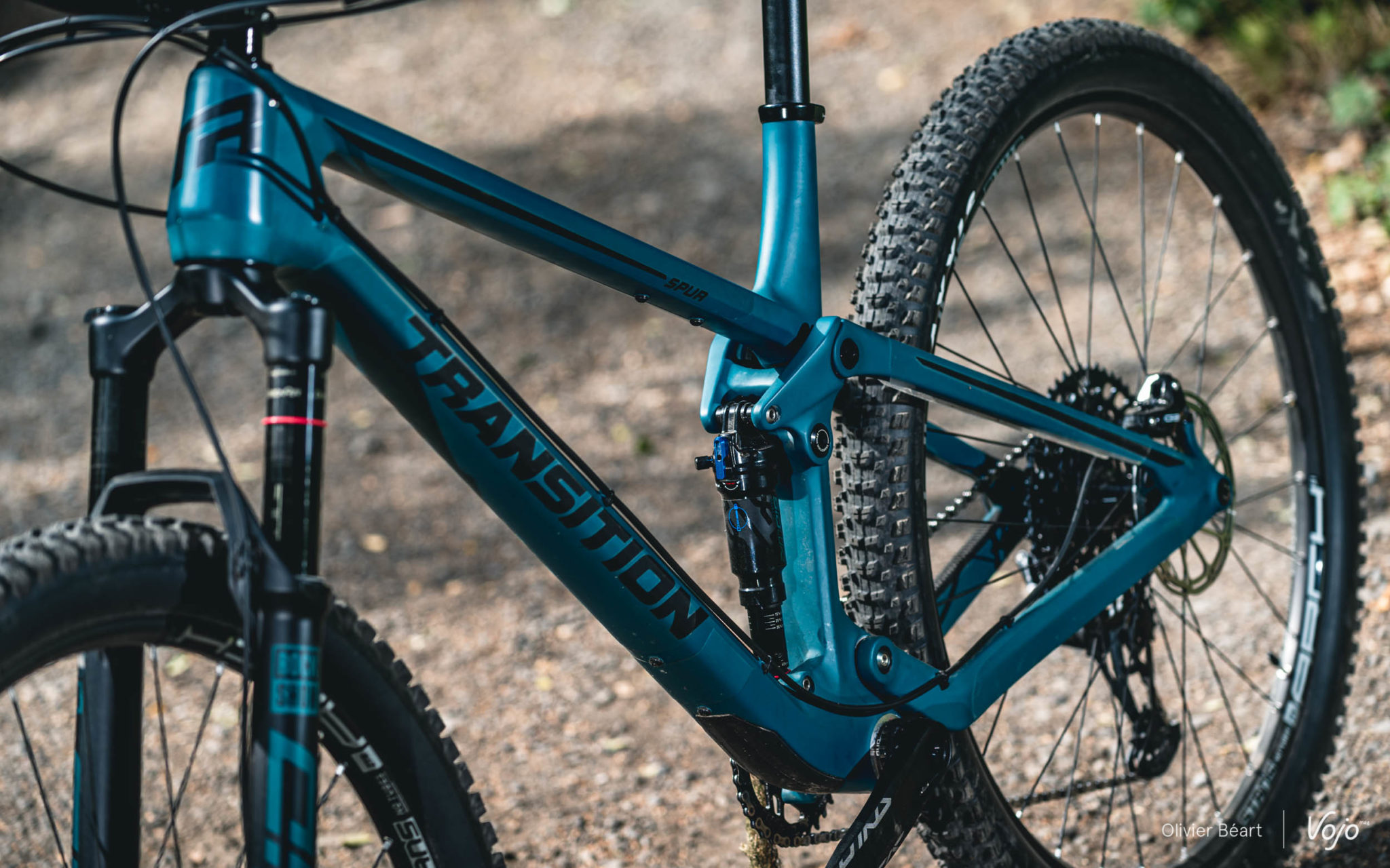 Les lignes ultra tendues du cadre rappellent clairement les dernières productions de la marque, mais en le voyant, il est impossible de ne pas penser non plus au fameux Scott Spark. D’ailleurs, en parlant du Spur, il nous est arrivé quelques fois (ainsi qu’à nos testeurs) de commettre le lapsus. Néanmoins, quand on les met côte à côte, même s’il y a quelques similitudes au niveau de la suspension et de la biellette, ainsi que de la silhouette globale, plusieurs détails trahissent assez vite la conception un peu plus ancienne du Spark, ainsi que la plus grande radicalité du Transition Spur qui n’est pas vraiment un pur vélo de XC tourné prioritairement vers le rendement mais plutôt un vélo à petit débattement fait pour descendre très, très vite. Bref, impossible de le confondre avec une énième copie du vélo de Nino Schurter : le Spur a une vraie personnalité, et c’est beau à voir.