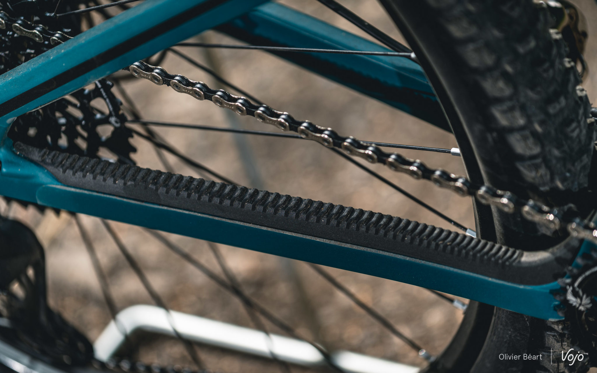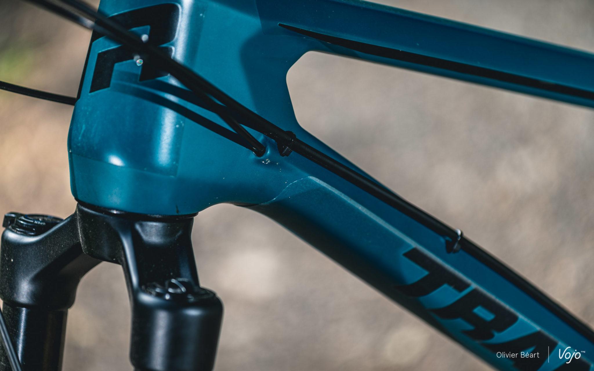 A noter que ce cadre est garanti à vie et qu’on y trouve des protections caoutchoutées parfaitement intégrées au niveau de la base droite et du bas du tube diagonal. Le passage des câbles a aussi été soigné. Afin de faciliter la vie des mécanos, le tout est guidé en interne et ressort au niveau du boîtier de pédalier avant de re-rentrer dans le bras arrière. La Durit de frein passe quant à elle entièrement en externe, ce qui est bien pratique et finalement pas si visible que cela. Toujours dans un esprit de fiabilité et de tranquillité d’esprit, le boîtier de pédalier est fileté.