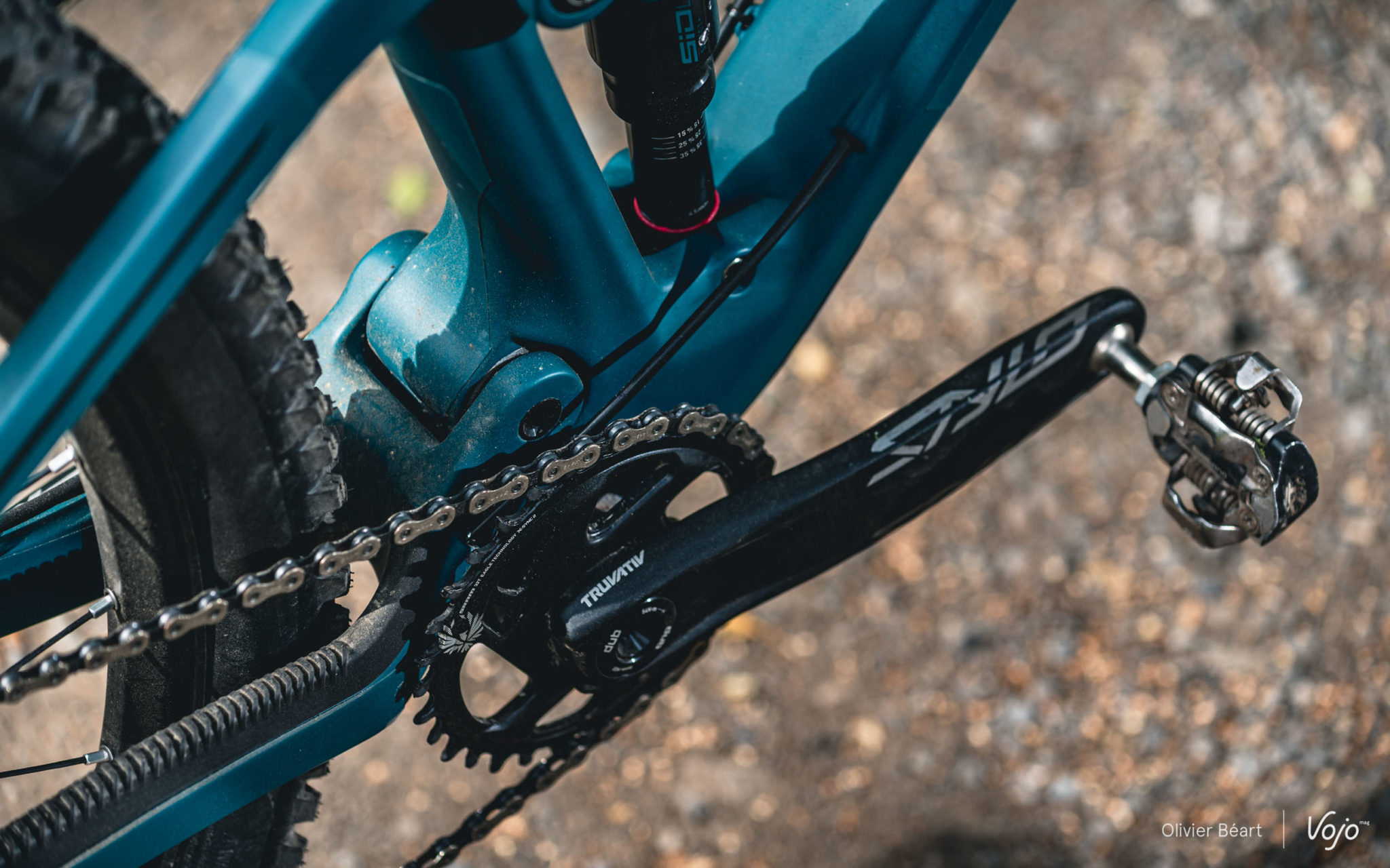 A l’arrière, le Spur peut se targuer d’être le premier vélo sur lequel le nouvel amortisseur SID Luxe nous a convaincus (il n’avait pas pleinement réussi à le faire sur le Specialized Epic Evo, ni sur l’Orbea Oiz sur lequel nous avions monté un exemplaire de test). Il a aussi tendance à avoir un retour un peu rapide, et il se montre plutôt ferme dans l’ensemble, mais il assure sur les successions d’impacts, colle bien la roue au sol et ne se montre jamais dépassé. On sent aussi qu’on parvient à bien le faire rentrer dans le débattement, ce qui est appréciable sur ce genre de machine. Dans l’ensemble, il colle bien à la philosophie générale du vélo et c’est bien cela qui compte.