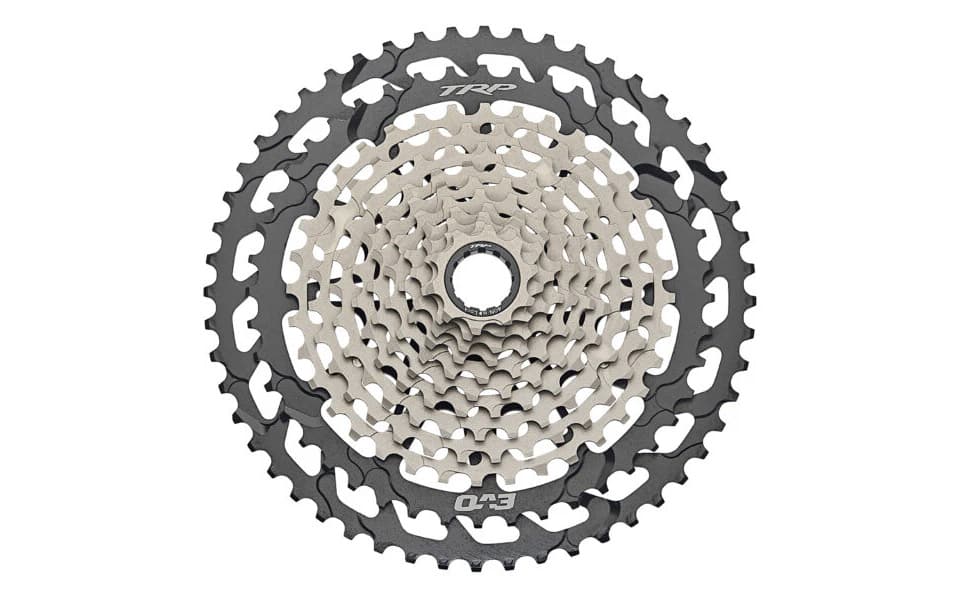 Comme beaucoup d’autres, la cassette TRP est composée de deux matériaux différents selon les pignons. Les deux plus grands (44 et 52 dents) sont en aluminium pour réduire le poids (372 g, soit seulement 5 g de plus qu’une cassette XTR 12 vitesses en denture 10-51). Les autres pignons forment un bloc en acier pour optimiser la durabilité. A noter que la cassette est uniquement disponible dans une version pour corps de roue libre Microspline (type Shimano).