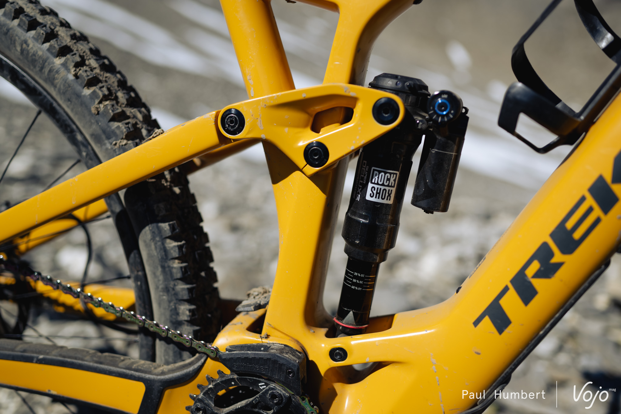 Dernier élément qui entre en jeu dans cette sensation, la suspension. Avec 140 mm, on peut déjà faire beaucoup de choses et ici, Trek a choisi de lui donner un caractère très dynamique et progressif. Cela a ses avantages et ses inconvénients mais lorsqu’on y ajoute la rigidité du système et la fragilité des pneus, ça rend la machine encore plus exigeante, même avec toutes les possibilités de réglages offertes par les éléments RockShox Ultimate.
