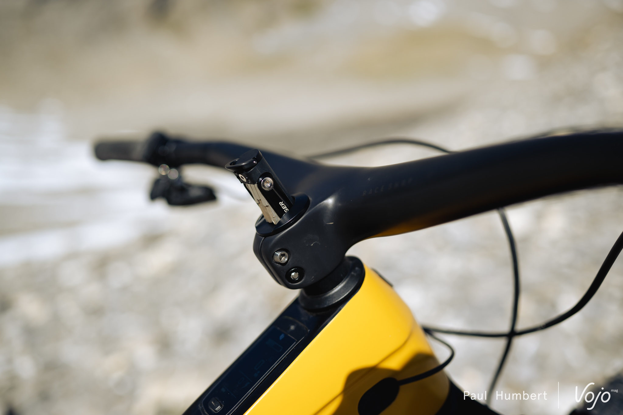 Pire encore, le câble électrique qui relie la (petite mais bien pensée) commande TQ au reste du système. A ce niveau, on pouvait s’attendre à un câble qui passe en interne dans le cintre pour ne ressortir qu’au dernier moment mais ce n’est pas le cas. Le cockpit Bontrager SL n’a pas été conçu pour et on se retrouve avec un câble trop long maintenu, sur notre modèle d’essai, par du scotch d’électricien. Ça se passe de commentaire.