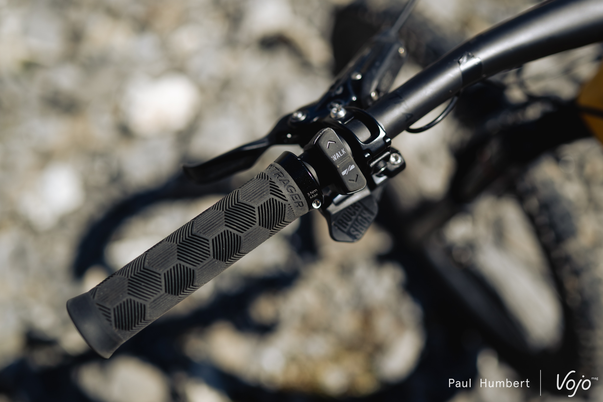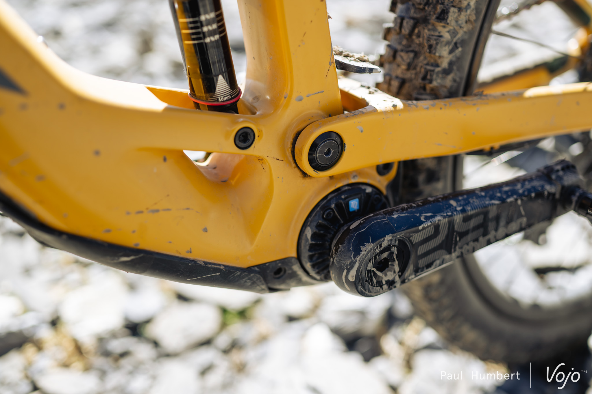 En dehors de ça, on note une plateforme équilibrée qui se roule comme on roulerait un vélo classique. Si le poids est proche de certains gros enduros en aluminium et pneus DH, la position est un peu plus sportive, plus « trail » et cela fait une belle différence en montée. On est bien placé sur le vélo pour négocier les sections raides ou techniques et le poids ne vient jamais se mettre en travers de nos ambitions comme cela peut l’être avec un e-bike au-dessus de 20-21 kg.