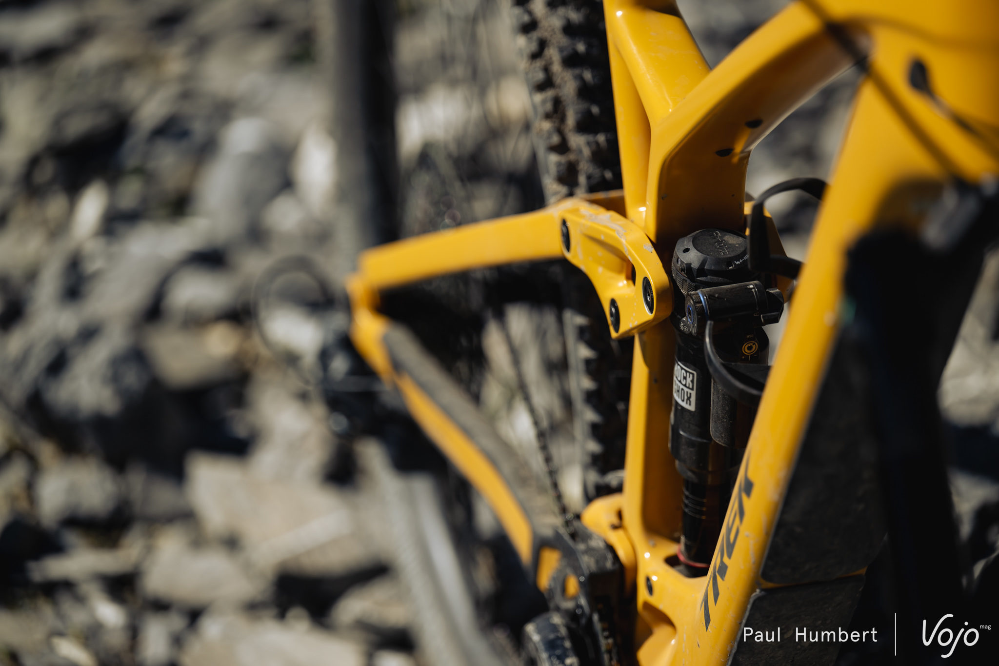 On ne parle pas ici de la finition du cadre en elle-même. Trek a fait le choix d’une relative sobriété avec cette peinture satinée sur tout le vélo et le rendu est très propre. Les zones critiques comme les points de pivots sont parfaitement réussies et la solidité semble au rendez-vous puisqu’aucune pierre n’a réussi à l’entamer pendant notre essai.