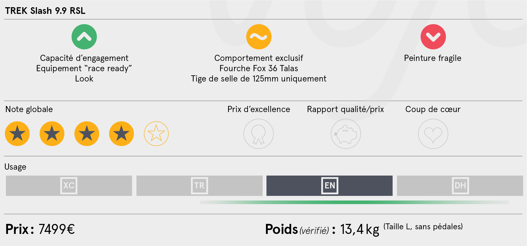Avec un look à tomber, un équipement sans faute et une construction sans compromis, le Trek Slash 9.9 RSL 29 pouces a tout pour être un excellent vélo pour les compétiteurs d’enduro évoluant en milieux montagneux. Un pilotage fin et engagé sera nécessaire pour tirer le meilleur de cette machine. En dehors du programme où si vous n’avez pas le bagage pour l’emmener, passez votre chemin, le Trek Slash 9.9 RSL n’est pas à mettre entre toutes les mains.