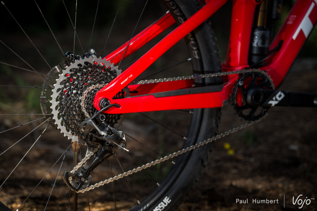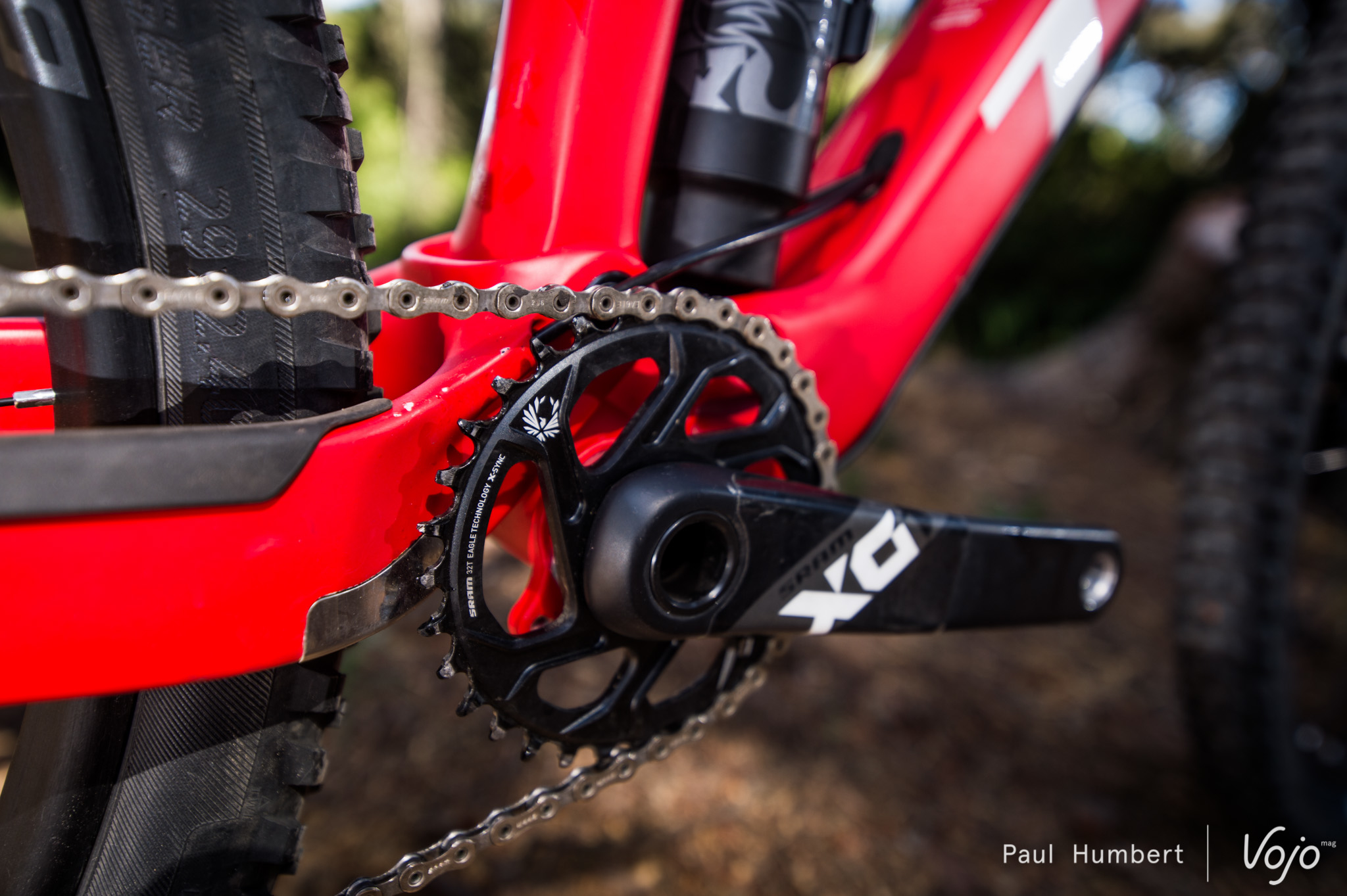 Sram équipe le Trek Slash 9.9 RSL de son groupe Eagle X01 et d’un plateau de 32 dents. Le tout est diablement efficace et on s’adapte parfaitement au programme du vélo.