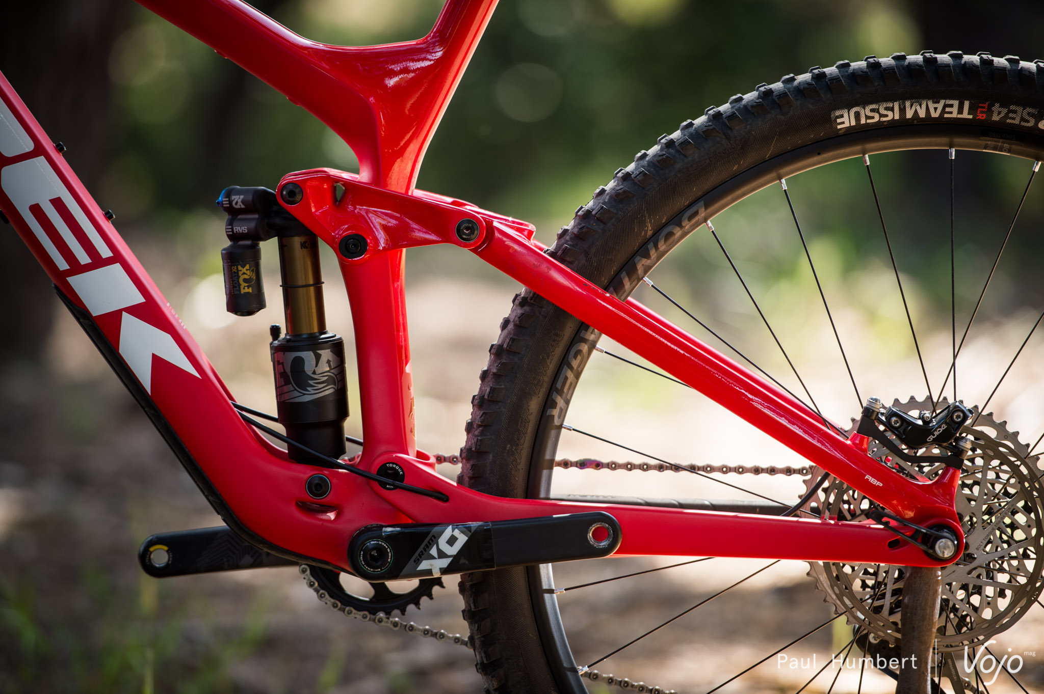 Avec ses haubans et ses bases qui se rejoignent en un même point de pivot, Trek conserve d’excellentes performances au freinage. La marque a baptisé ce système « ABP », pour « Active Braking Pivot », et le décline sur tous ses fulls.