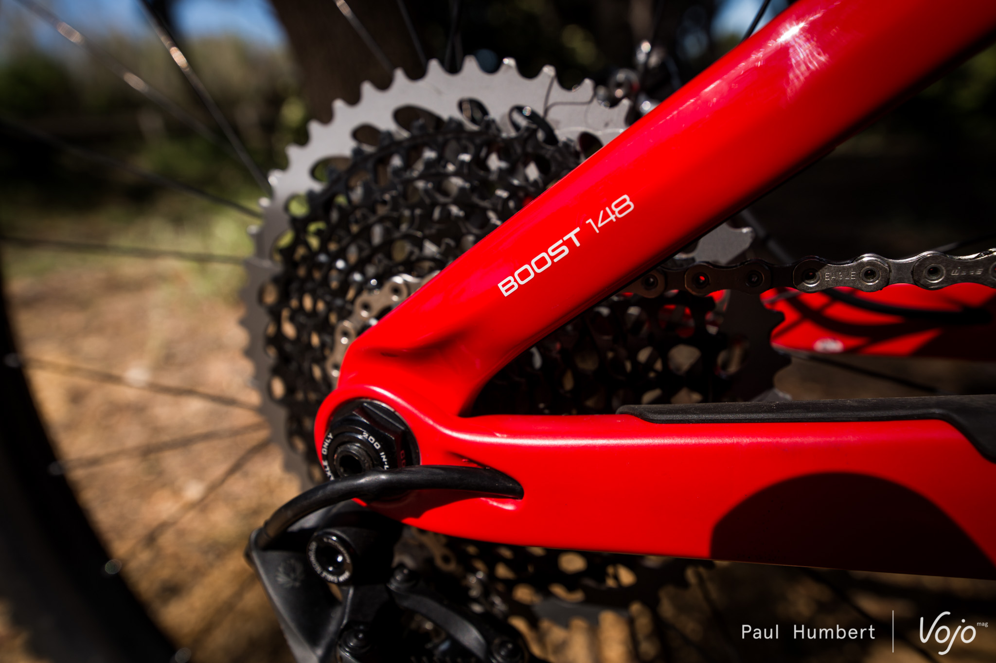 Le cadre est tout en carbone et développe un débattement de 150mm. On retrouve tous les derniers standards comme le boost (148, 110mm) ou la transmission exclusivement mono-plateau, dans la mesure où ils sont utilisés comme partie intégrante de la conception de la partie arrière du vélo afin d’offrir des bases courtes, de moins de 435mm.