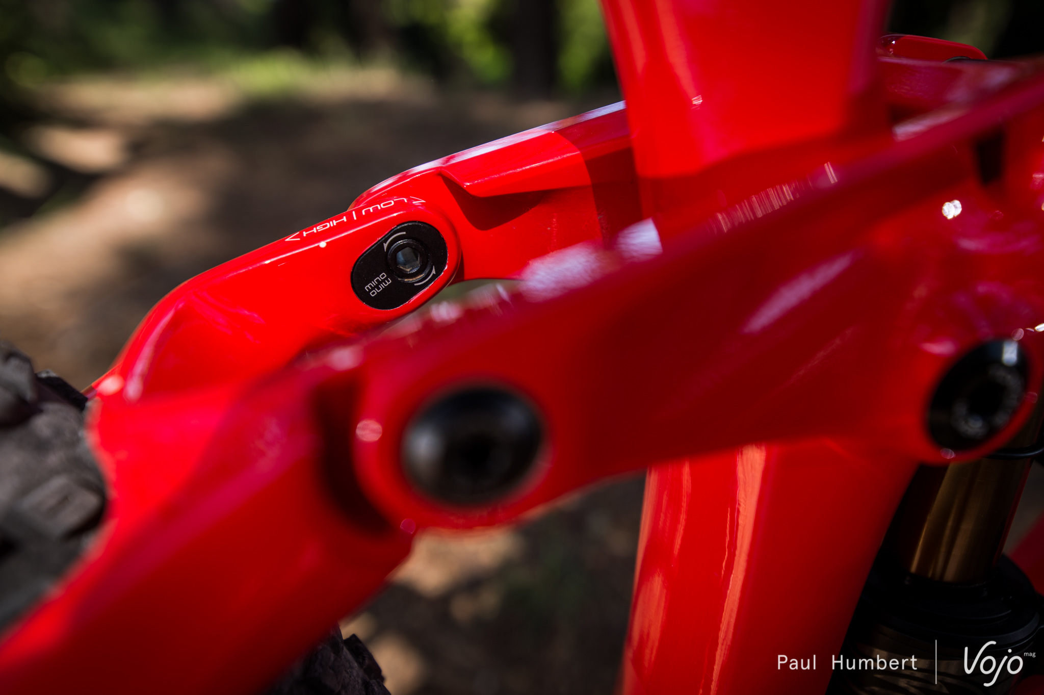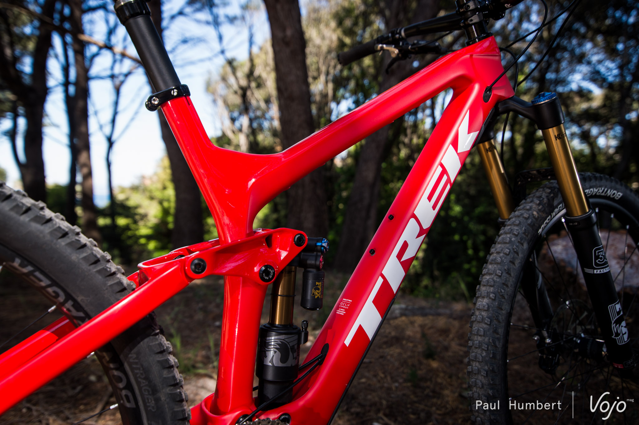 Comme sur la majorité des VTT all-mountain et plus gros chez Trek, on retrouve le « Mino-Link », une petite pièce permettant de changer en un tour de vis la géométrie du cadre. Plus ouvert pour « envoyer » ou plus fermé pour conserver plus de dynamisme, les deux positions ont leurs avantages et leurs inconvénients mais permettent de s’adapter à de très nombreux terrains.