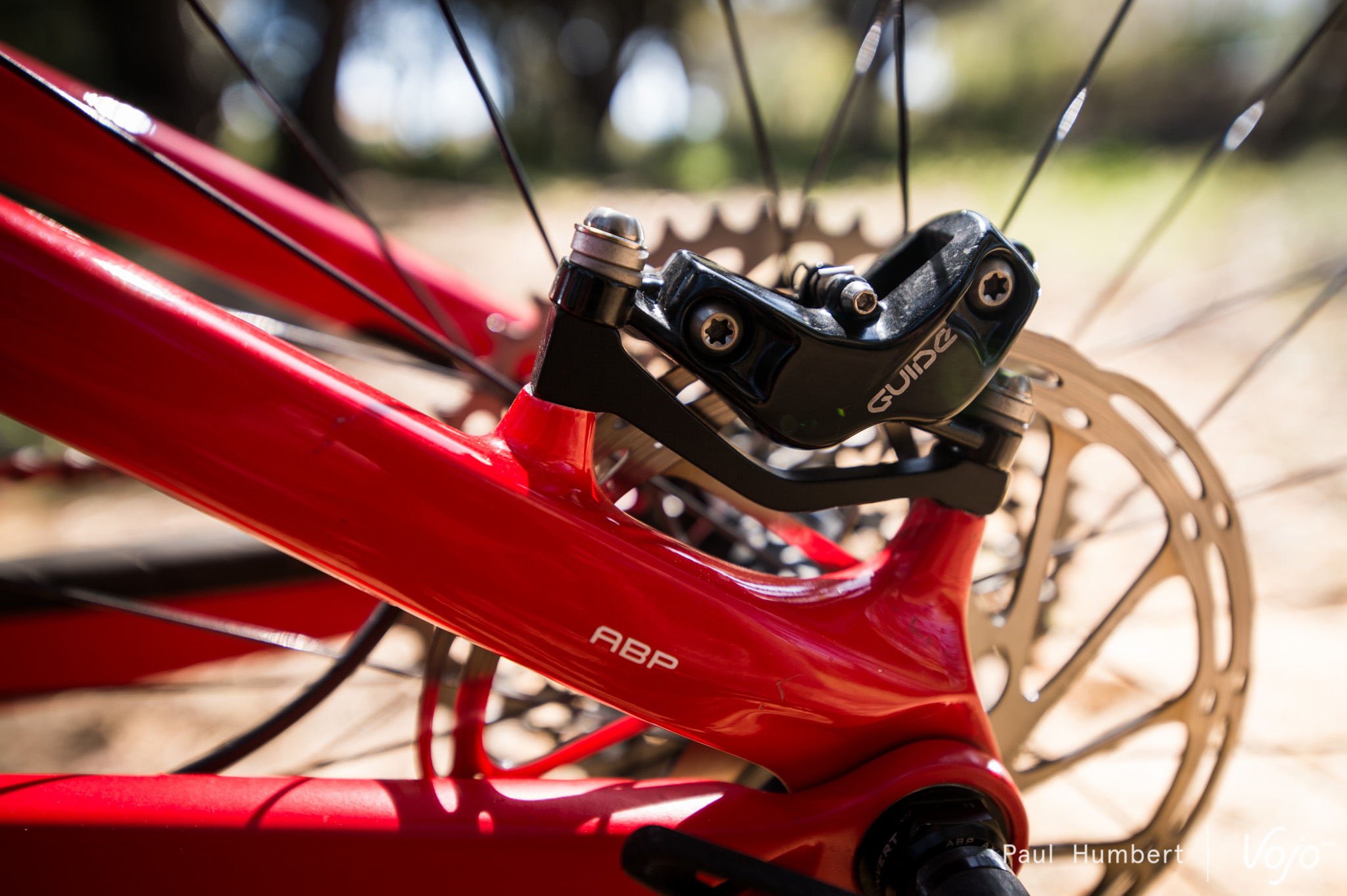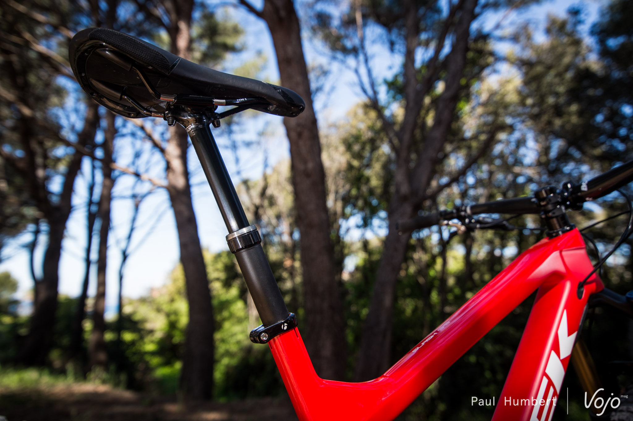 La tige de selle a été présentée par Bontrager en 2016 avec son levier (à câble) de commande intérieur. Le tout fonctionne convenablement mais nous aurions aimé voir les débattements évoluer en fonction des tailles. Là, la tige de selle affiche 125mm sur les 4 tailles de cadre et pour les grands, c’est peu. Le freinage est confié au tout haut de gamme de Sram avec les Guide Ultimate.