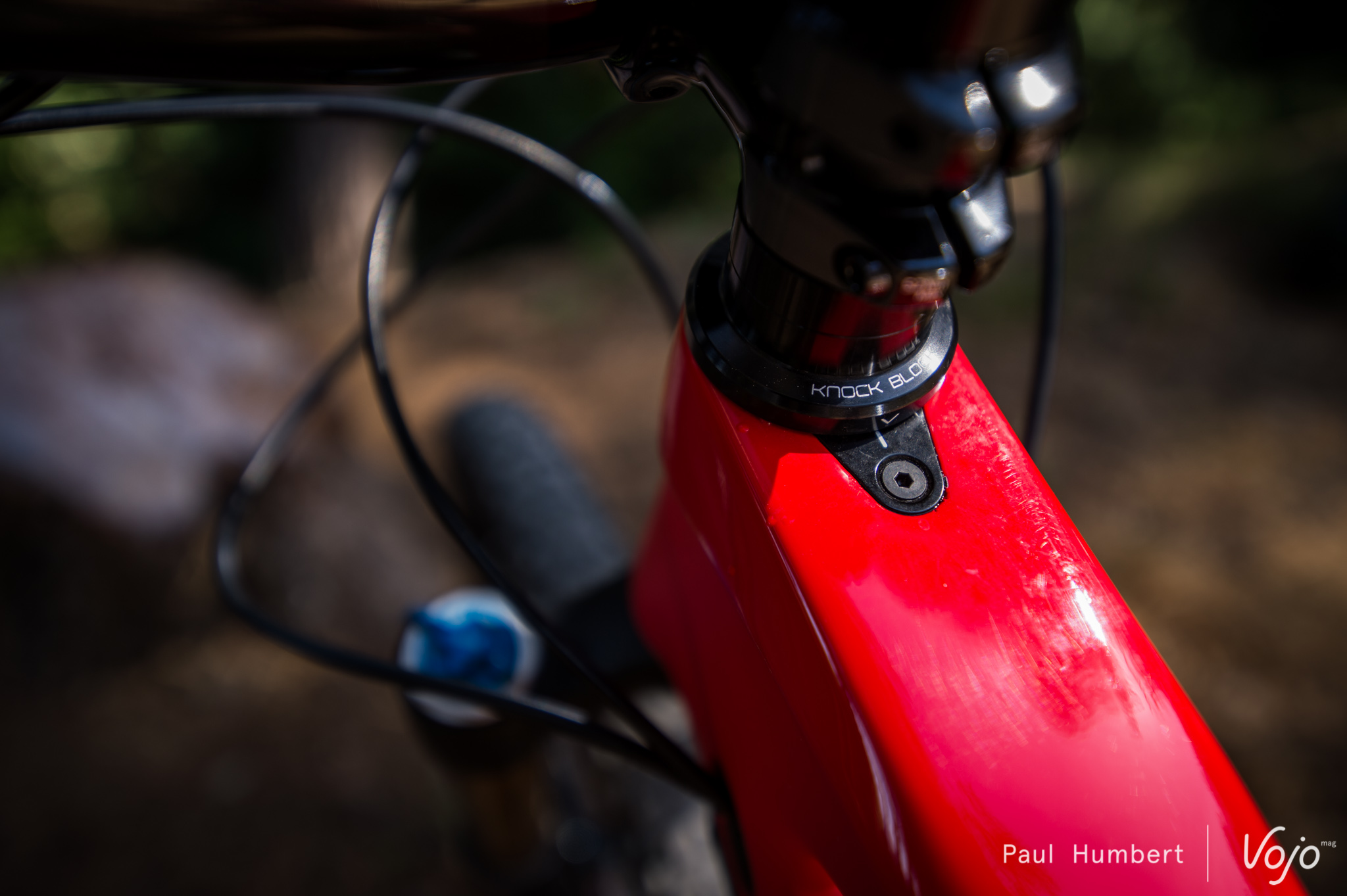 Le cadre du Trek Slash 9.9 regorge de petits détails. Côté protection, on remarque la présence d’un jeu de direction intégrant un « Knock block system ». Pour faire simple, le design du cadre n’isole pas le tube inférieur du té de la fourche, qui peut venir l’impacter. Le « Knock Block system » se situe dans le jeu de direction et utilise une petite pièce (remplaçable) qui vient faire « fusible » et bloquer la rotation de la fourche. Des potences d’autres marques sont utilisables. Et pour une petite dose de protection en plus, des inserts en caoutchouc équipent le haut du cadre.
