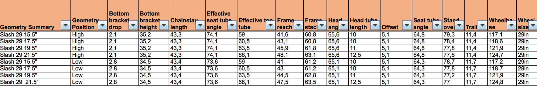 Au total, le vélo affiche 1219mm de long en taille L (19,5″). Le Trek Slash est disponible en quatre tailles à des tarifs allant de 3999 à 7499 euros pour le modèle RSL.