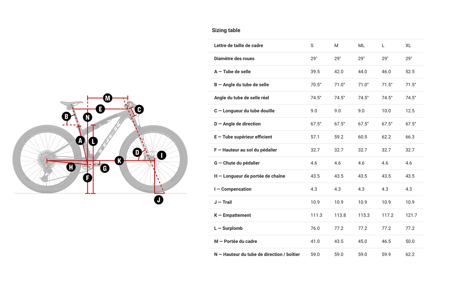 Assez contemporain dans sa conception, le Trek SuperCaliber se veut également dans le coup au niveau de ses cotes de géométrie avec, en taille M, un angle de direction de 67,5°, un angle de tube de selle de 74,5°, des bases de 435 mm et un reach de 465 mm. Si la précédente génération offrait pas moins de 6 tailles pour le SuperCaliber, cette seconde génération s’en contente de 5, de S à XL.