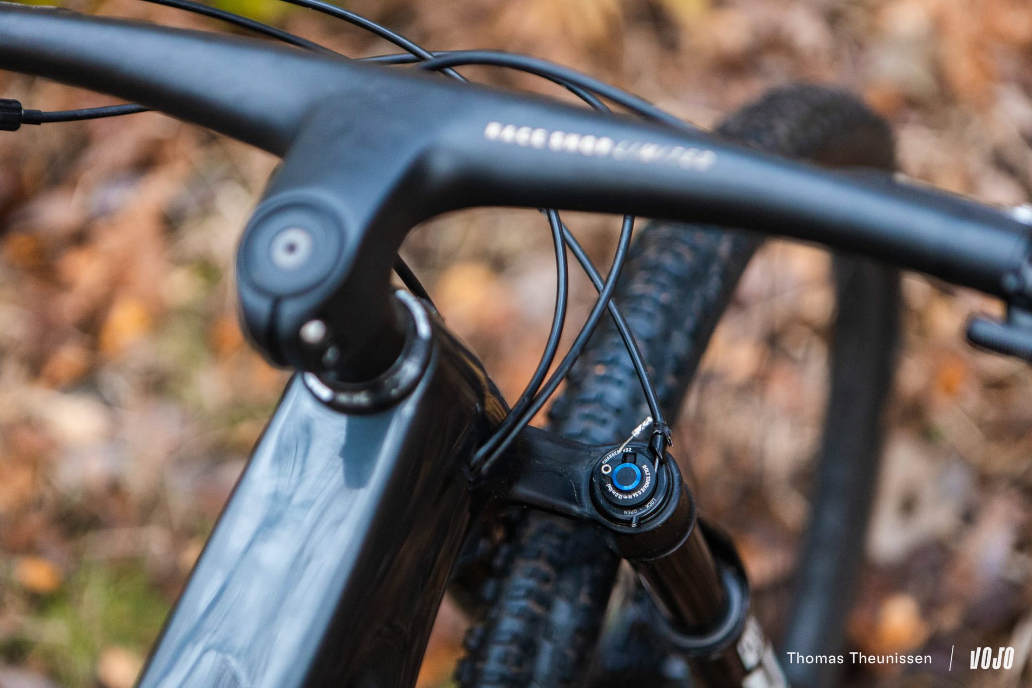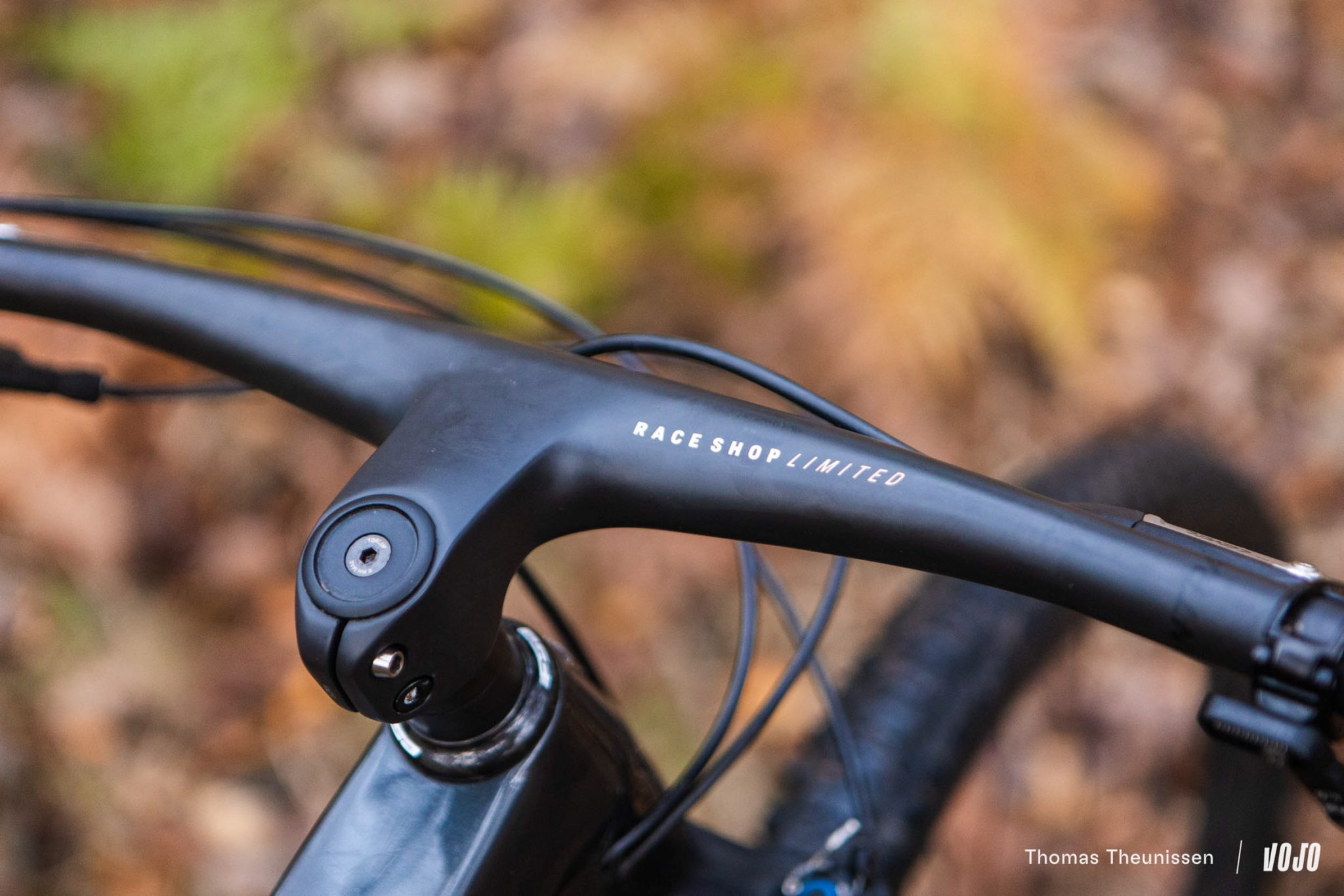 Pour les périphériques, on retrouve également du connu avec une tige de selle télescopique en provenance de chez Fox (Fox Transfer SL) et un joli poste de pilotage maison en une pièce et en carbone. De série, le cintre fait 750mm de large tandis que la potence est une 80mm avec une inclinaison de -13°. Pour la selle, c’est une très bonne Aeolus RSL aux rails en carbone.