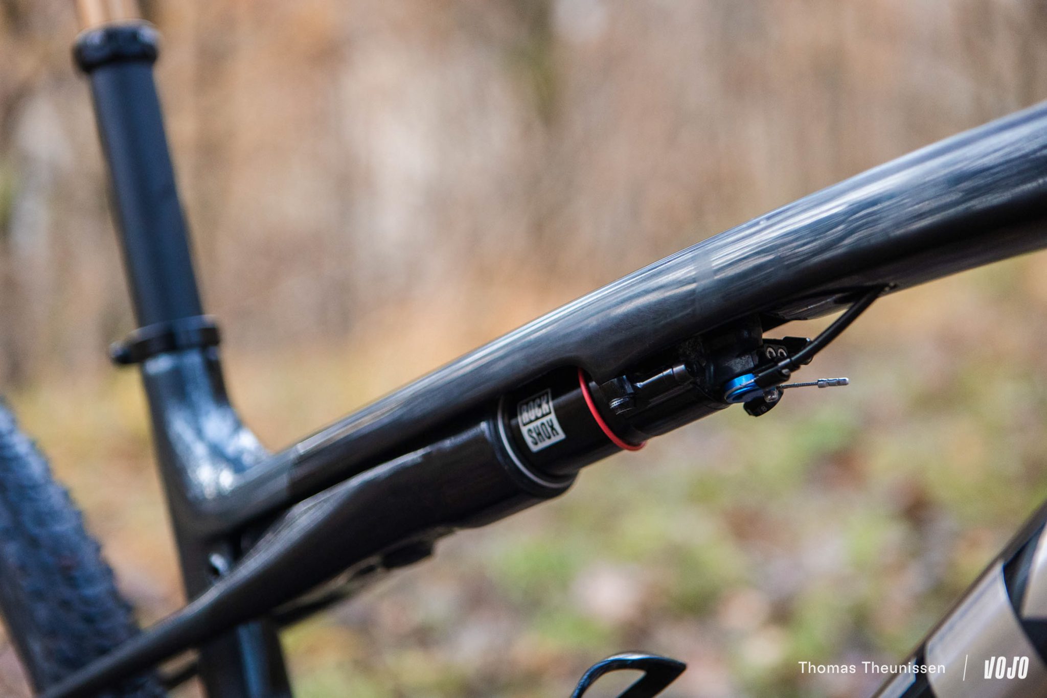 Cette augmentation du débattement a nécessité la conception d’un tout nouvel amortisseur, qui a cette fois été développé avec RockShox au lieu de Fox. Basé sur le SIDLuxe, ses dimensions sont plus grandes que celles de l’ancien modèle (240×40 contre 235×32,5) et son plongeur plus gros (38 mm de diamètre), ce qui permet d’augmenter la rigidité du cadre et l’utilisation d’un piston plus gros, facteur d’une meilleure gestion des flux d’huile.