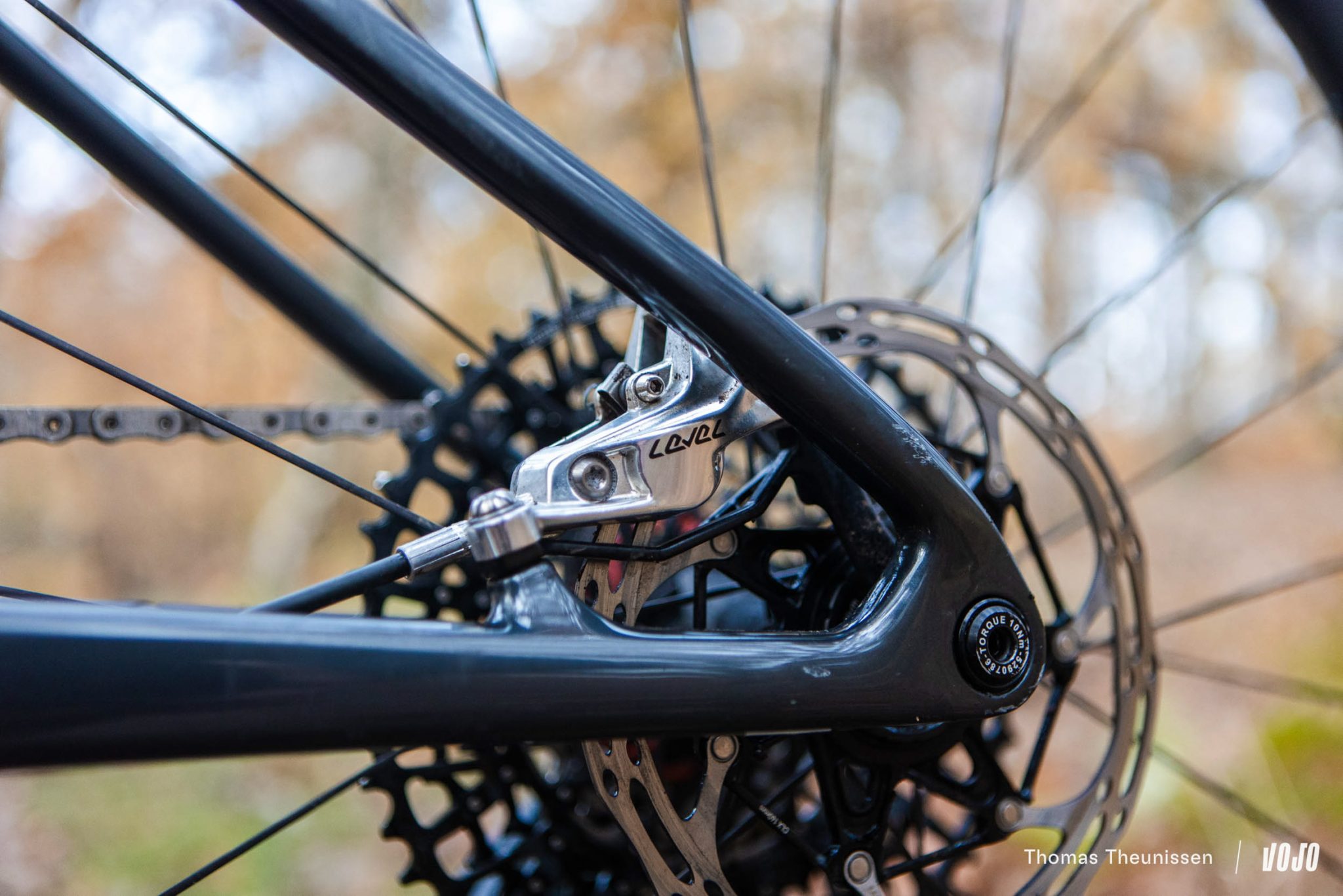 Le hauban gauche mérite également un moment d’attention : légèrement dévié pour laisser passer l’étrier de frein, ce dernier est flottant (comprenez par là qu’il pivote avec la flexion de la suspension) afin de mieux isoler la suspension des forces de freinage.
