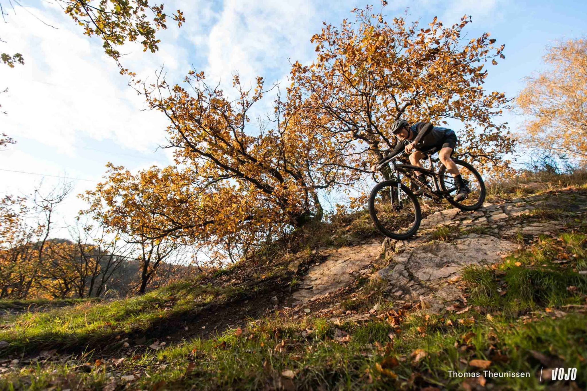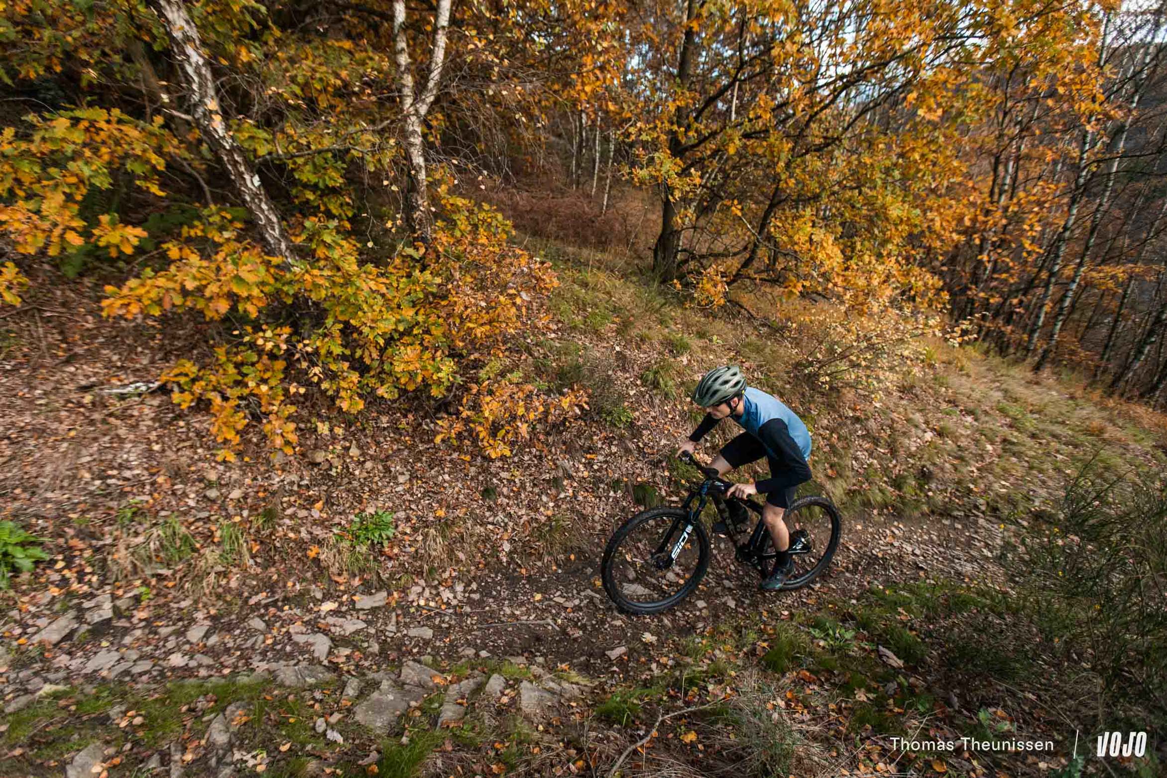 Le vélo reste assez haut dans son débattement et l’on se sent bien positionné pour attaquer ces passages techniques en côte, avec un caractère calme et posé, notamment grâce à l’allongement des bases et à l’ouverture de l’angle de chasse par rapport à la première génération. Le SuperCaliber offre ainsi cette impression que tout est plus simple et que l’on a juste à se concentrer sur notre pédalage.