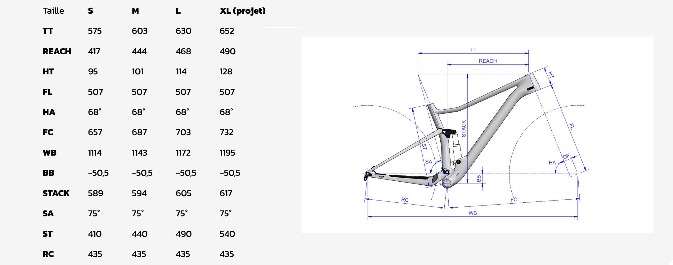 La fiche de géométrie que nous présentons ci-dessus est celle du Panache TS, en 100 mm donc. Ces données ne sont là qu’à titre indicatif, pour se faire une idée des cotes du TS+, car la marque n’a pas su nous présenter le tableau exact pour le Panache TS+. Or, les deux vélos partageant le même cadre, il est impossible qu’ils aient la même géométrie puisque le TS+ utilise une fourche plus haute que le TS.